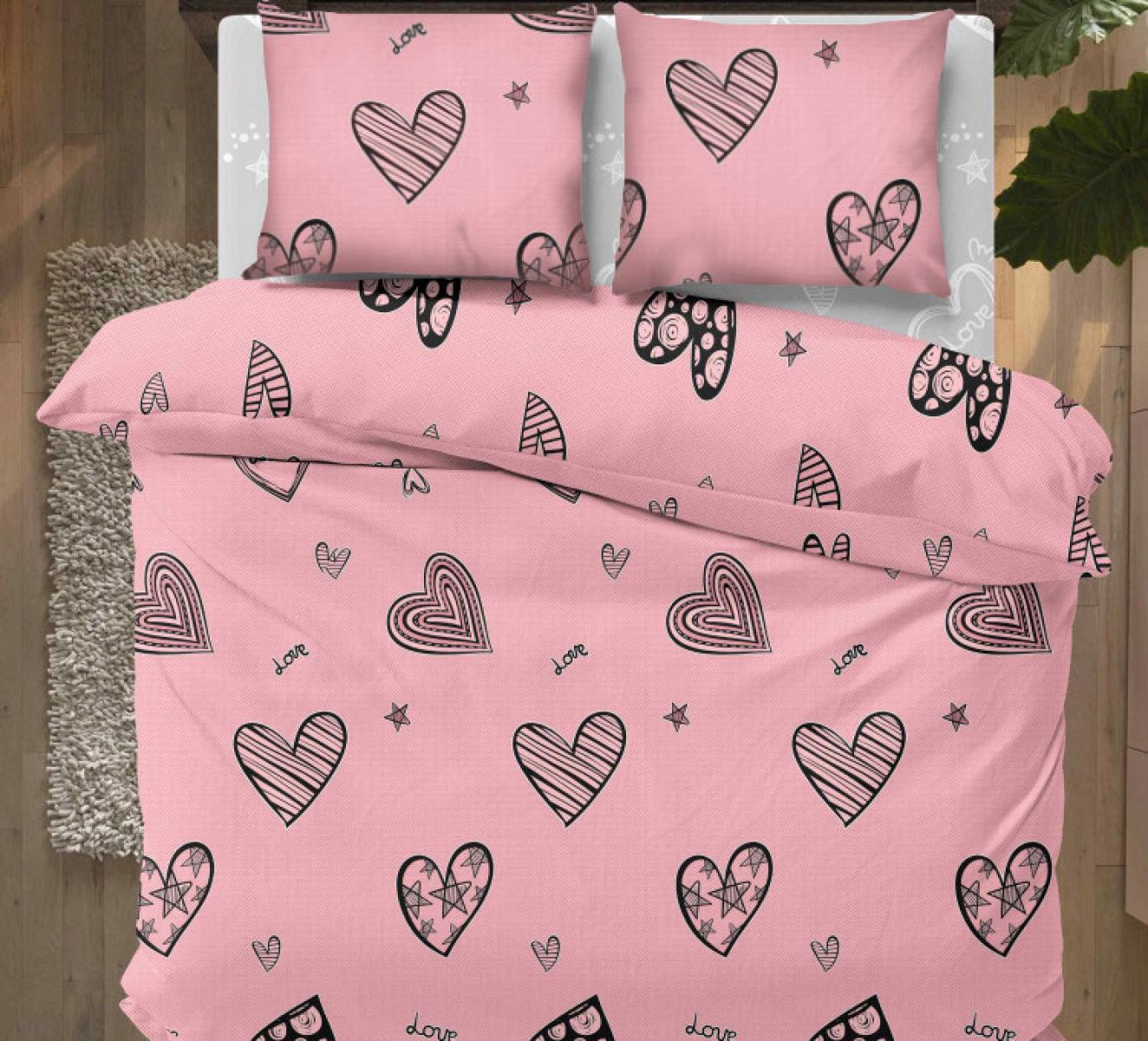 Наволочка Сердцеедка выполнена из основной ткани (как наволочки и пододеяльник на фото).