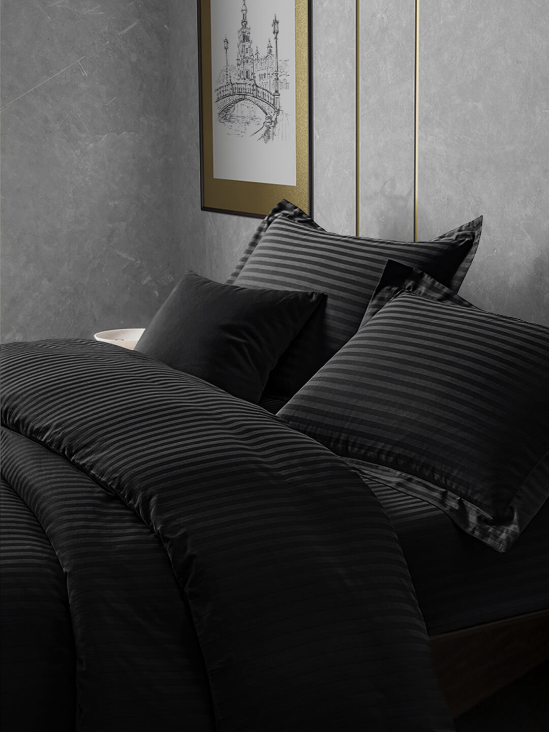Постельное белье сатин страйп с простыней на резинке / Черный