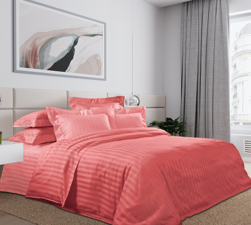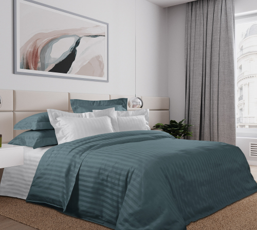 Комплект выполнен из пакистанского хлопка высшего качества, ткани страйп-сатин, прочной, износоустойчивой и очень красивой. Мягкость и блеск ее часто сравнивают с шелком. На поверхности можно рассмотреть чередующиеся глянцевые и матовые полоски, образованные благодаря особому способу переплетения нитей. Ширина контрастной полоски 2 см.