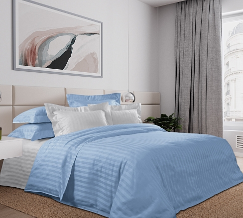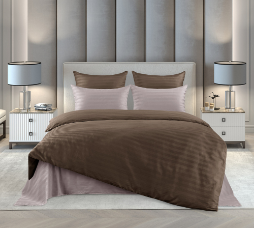 Комплект выполнен из пакистанского хлопка высшего качества, ткани страйп-сатин, прочной, износоустойчивой и очень красивой. Мягкость и блеск ее часто сравнивают с шелком. На поверхности можно рассмотреть чередующиеся глянцевые и матовые полоски, образованные благодаря особому способу переплетения нитей. Ширина контрастной полоски 2 см.