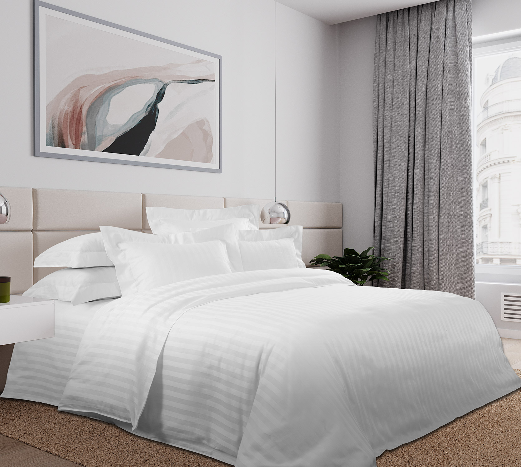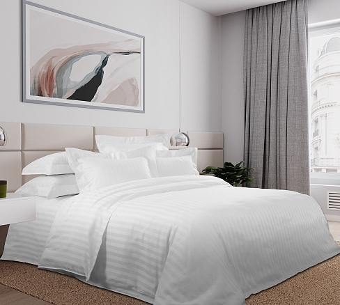 Комплект выполнен из пакистанского хлопка высшего качества, ткани страйп-сатин, прочной, износоустойчивой и очень красивой. Мягкость и блеск ее часто сравнивают с шелком. На поверхности можно рассмотреть чередующиеся глянцевые и матовые полоски, образованные благодаря особому способу переплетения нитей. Ширина контрастной полоски 2 см.