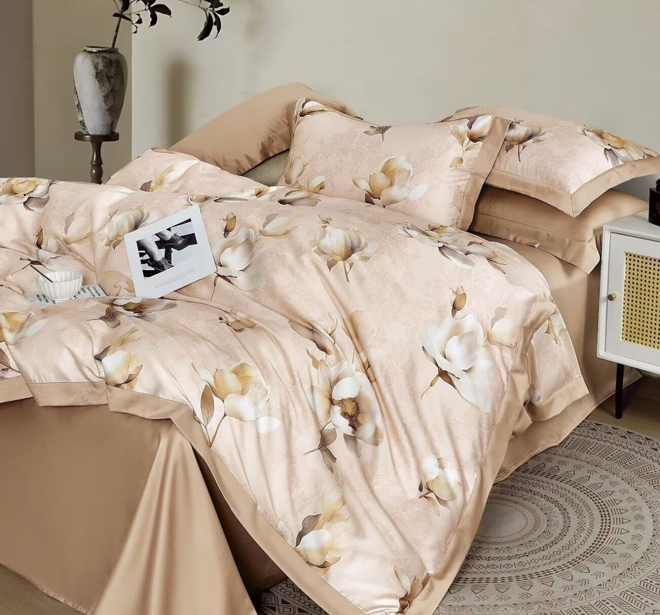 Простыня Магнолия сшита из основной ткани (как верх пододеяльника на фото).