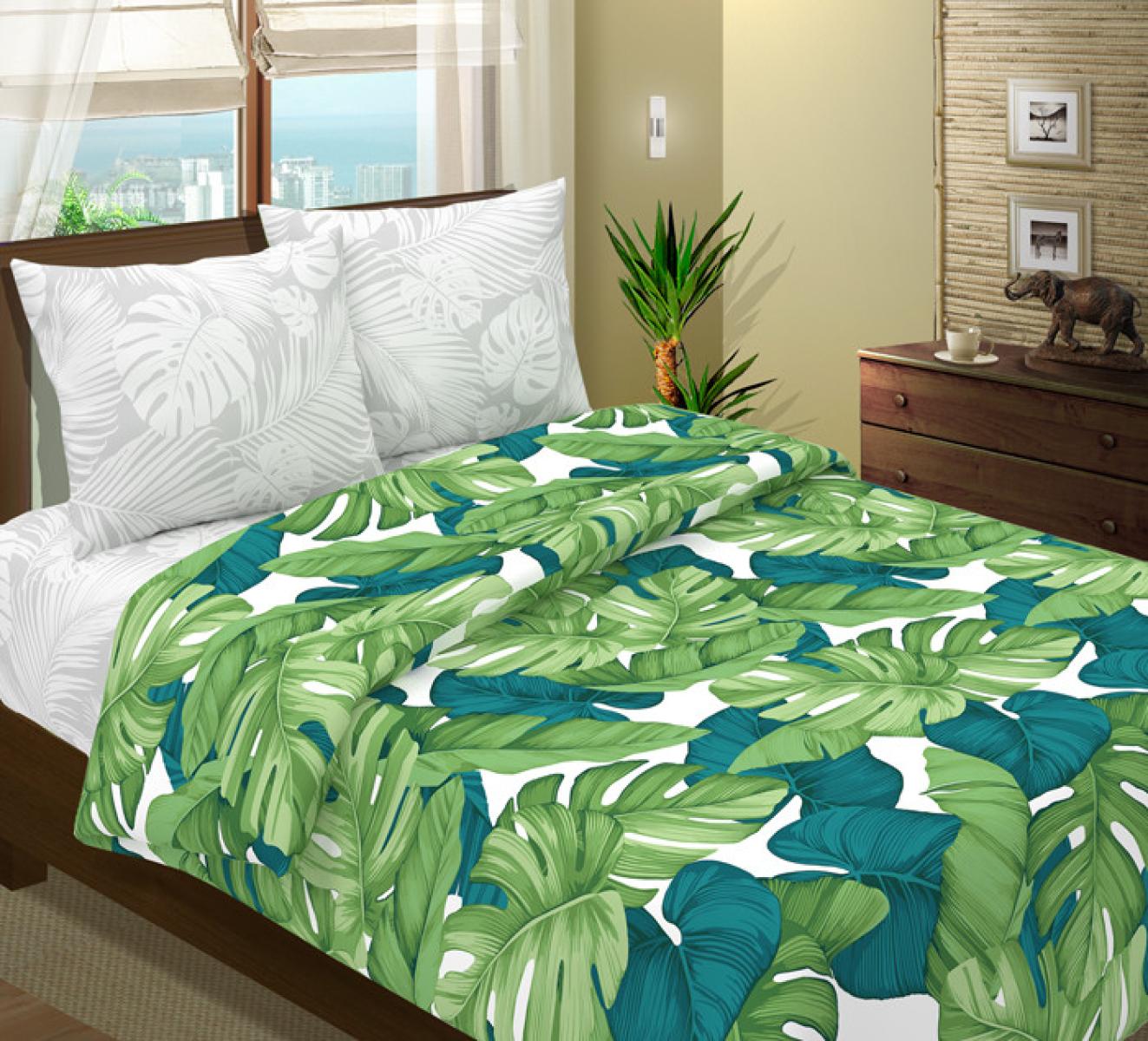 Простыня Монстера сшита из ткани-компаньона (как простыня и наволочки на фото).