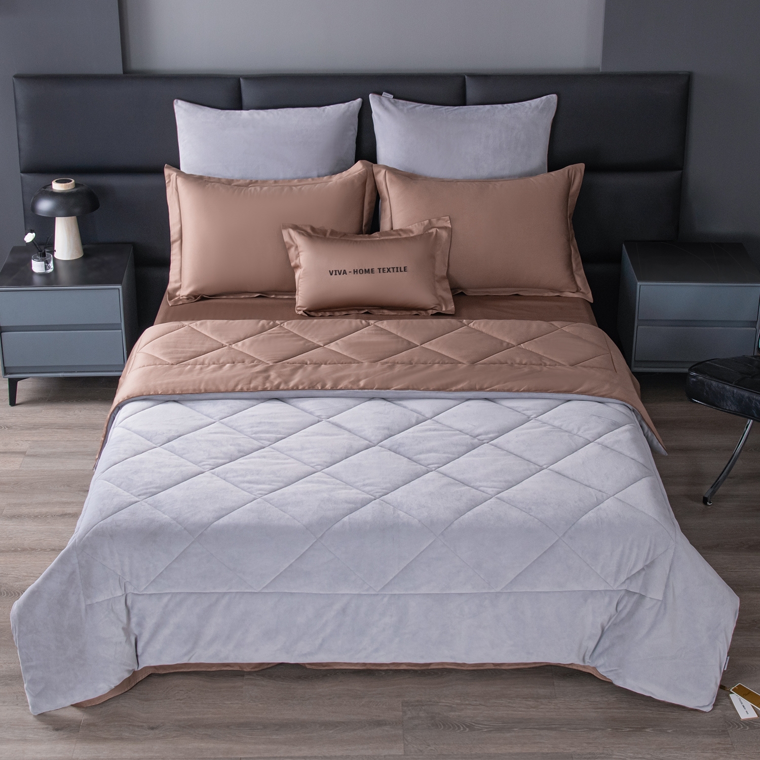Одеяло выполнено с изысканной геометрической стёжкой и оформлено бархатным кантом. Верхняя сторона - мягкий велюр, придающий комплекту благородный внешний вид и особую уютность. Нижняя сторона - гладкий сатин из 100% египетского хлопка, отличающийся особой прочностью, шелковистым блеском и естественной воздухопроницаемостью. Наполнитель - современное 100% эковолокно микрогель: лёгкий, гипоаллергенный материал, который сохраняет форму даже после многократных стирок. Зимой под таким одеялом тепло и комфортно, а летом - свежо и легко, благодаря отличной циркуляции воздуха