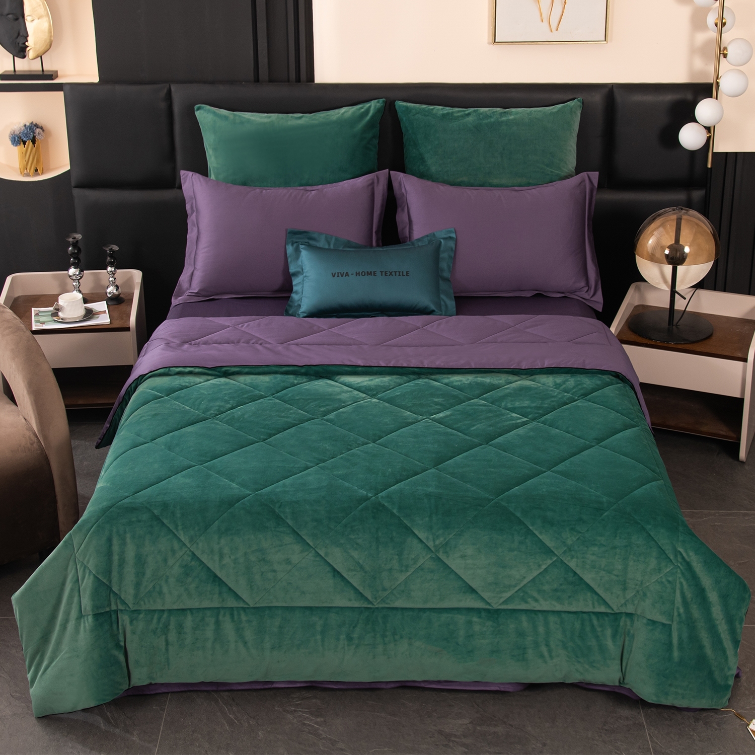 Одеяло выполнено с изысканной геометрической стёжкой и оформлено бархатным кантом. Верхняя сторона - мягкий велюр, придающий комплекту благородный внешний вид и особую уютность. Нижняя сторона - гладкий сатин из 100% египетского хлопка, отличающийся особой прочностью, шелковистым блеском и естественной воздухопроницаемостью. Наполнитель - современное 100% эковолокно микрогель: лёгкий, гипоаллергенный материал, который сохраняет форму даже после многократных стирок. Зимой под таким одеялом тепло и комфортно, а летом - свежо и легко, благодаря отличной циркуляции воздуха