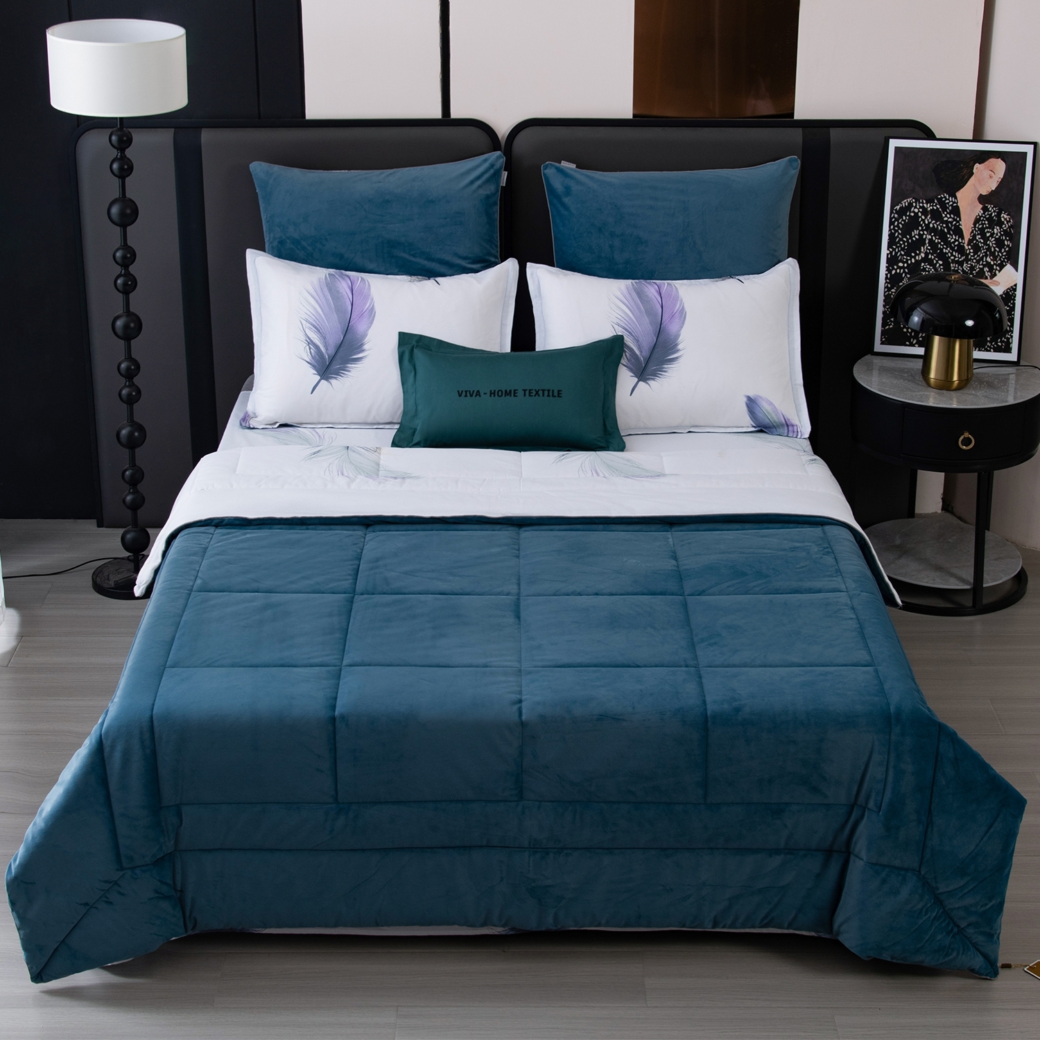 Ткань компаньон: Одеяло и наволочки 70x70 с разных сторон разной расцветки и ткани; наволочки 50x70 с разных сторон разной расцветки (принт/однотонный); простыня такого же цвета, как низ одеяла.