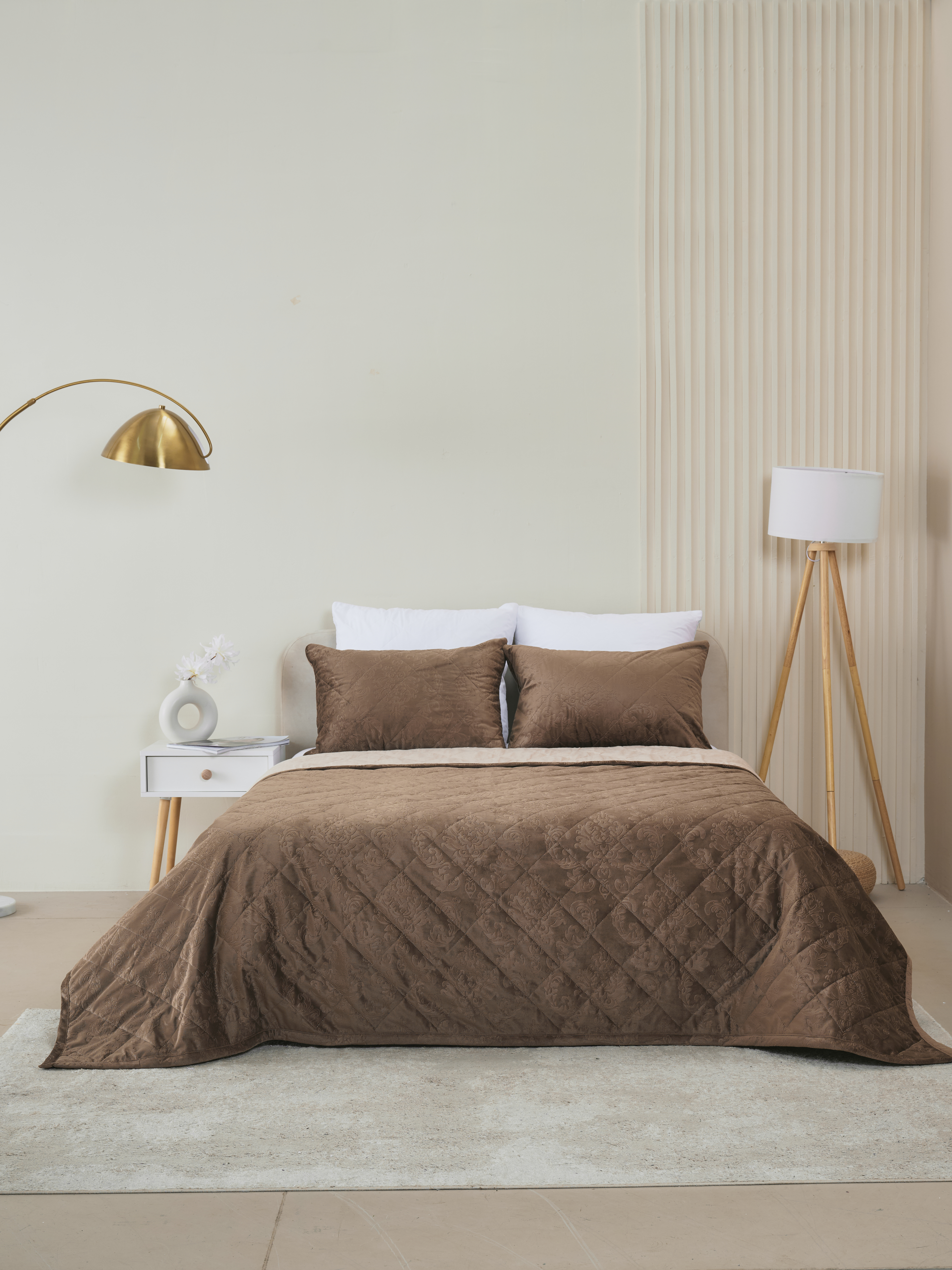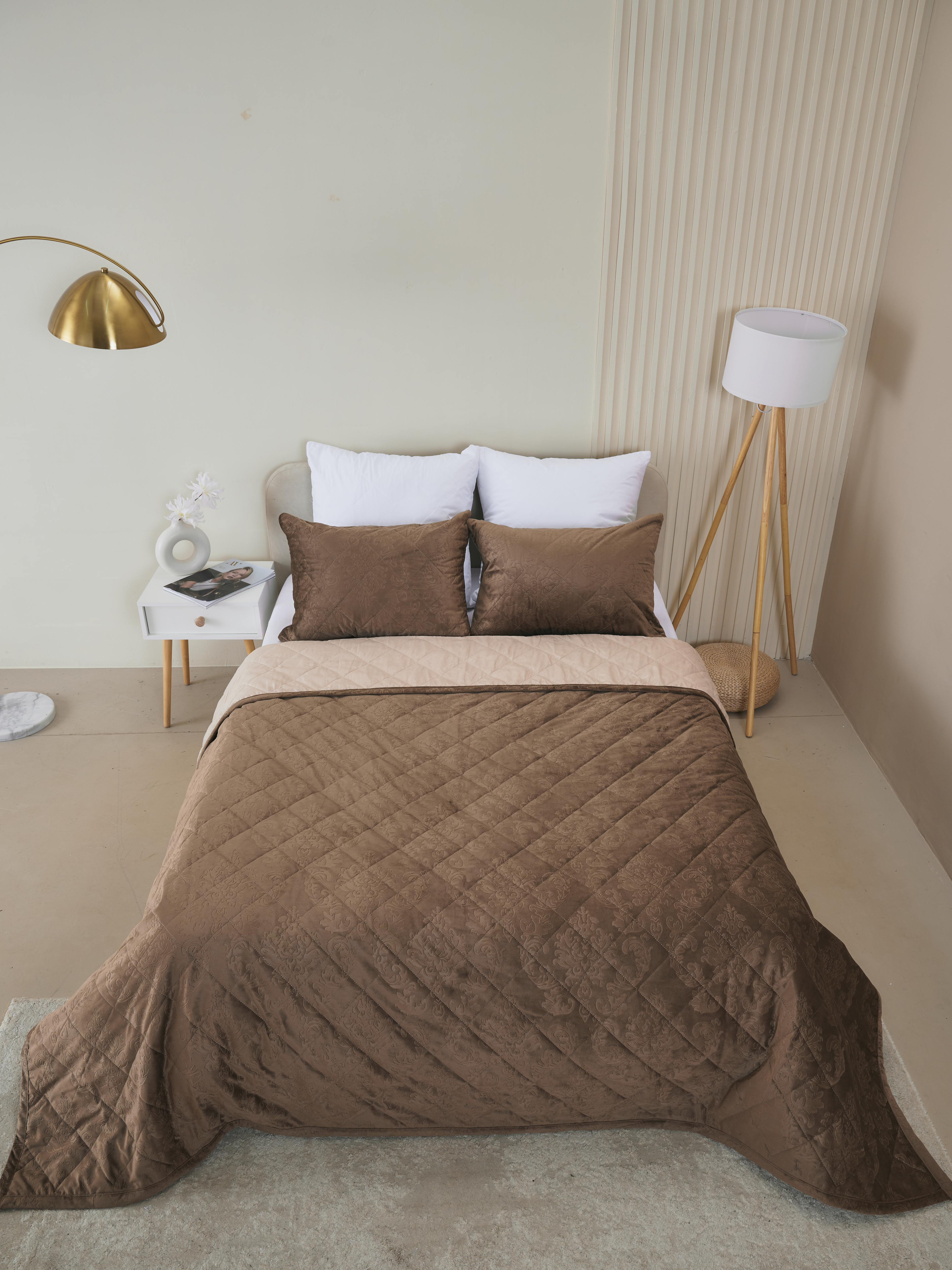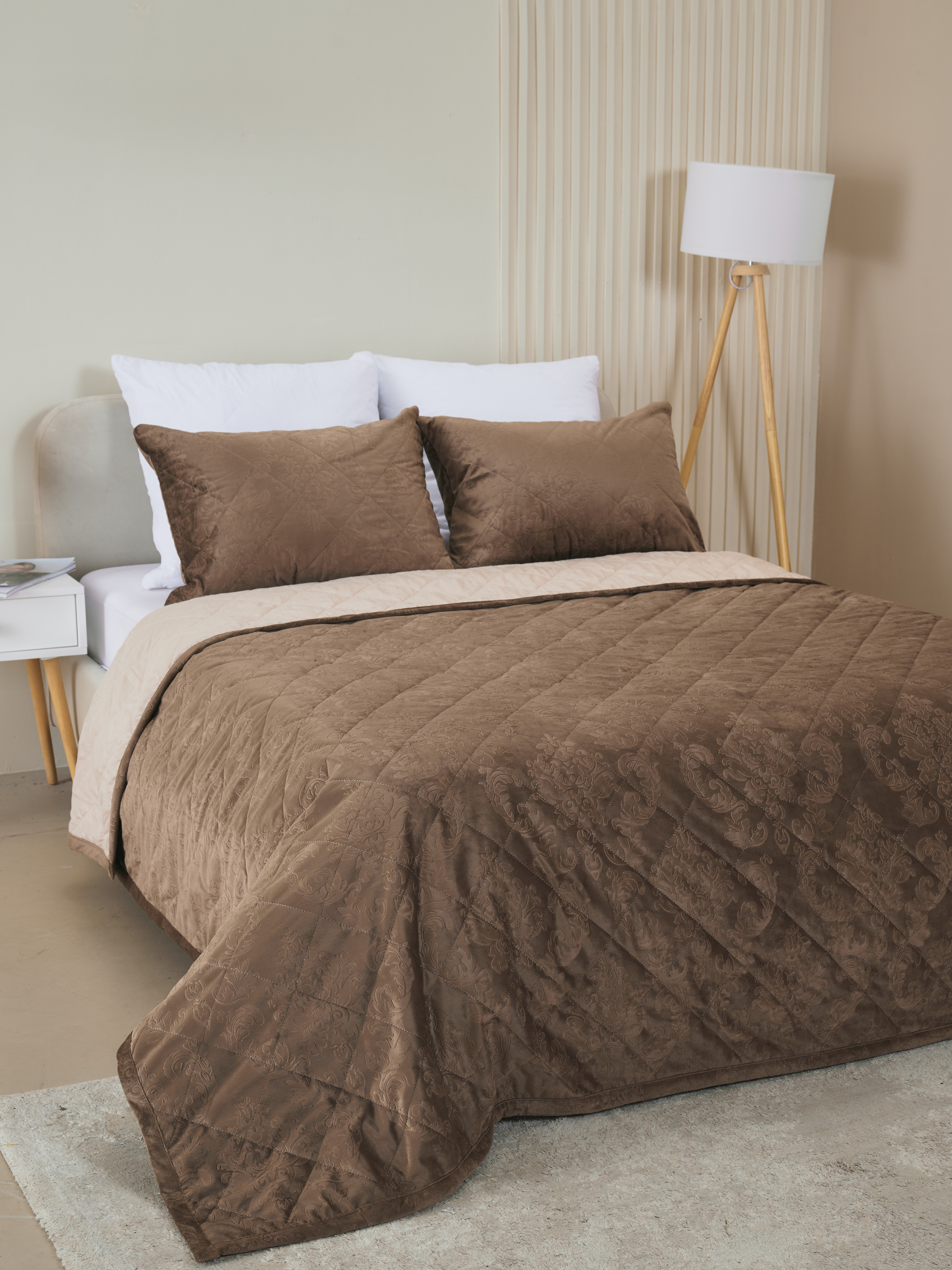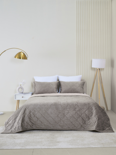 Погрузитесь в мир уюта с нашим набором, включающим в себя покрывало из микрофибры и чехлов на подушку, выполненных из высококачественного велюра. Мягкое и приятное на ощупь покрывало создано для безмятежной атмосферы в вашей спальне или гостиной. Его нежная текстура не только добавляет интерьеру стиля, но и обеспечивает легкость в уходе, благодаря своей устойчивости к загрязнениям и быстрому высыханию, после стирки. Чехлы с молнией надежно защищают ваши подушки и обеспечивают легкость и удобство, при уходе. Этот комплект станет идеальным решением для тех, кто ценит комфорт и элегантность в каждой детали.