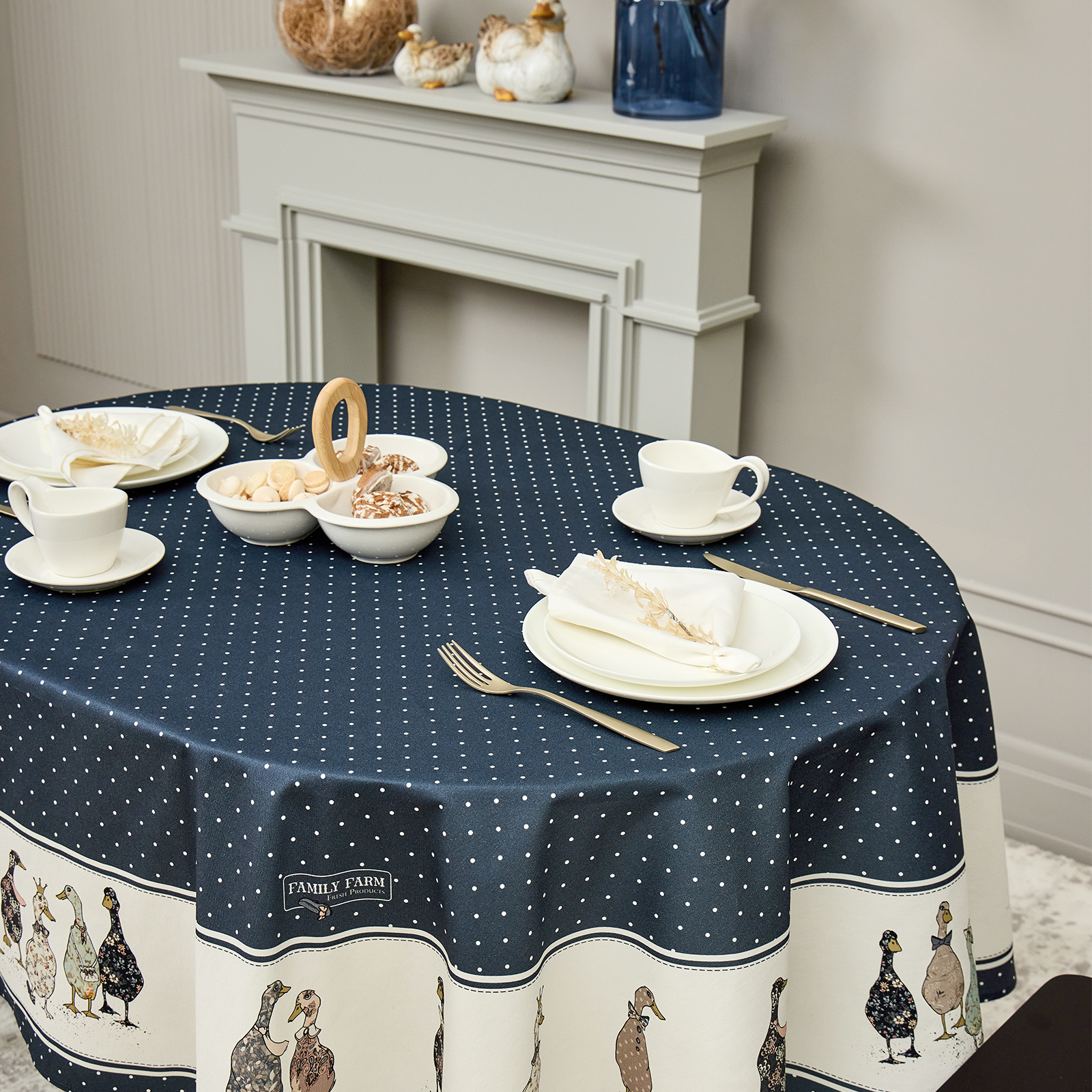 СКАТЕРТЬ ОВАЛЬНАЯ "FAMILY FARM" 140Х180СМ ,СИНИЙ,100% ХЛОПОК,ТВИЛ,С ПРОПИТКОЙ