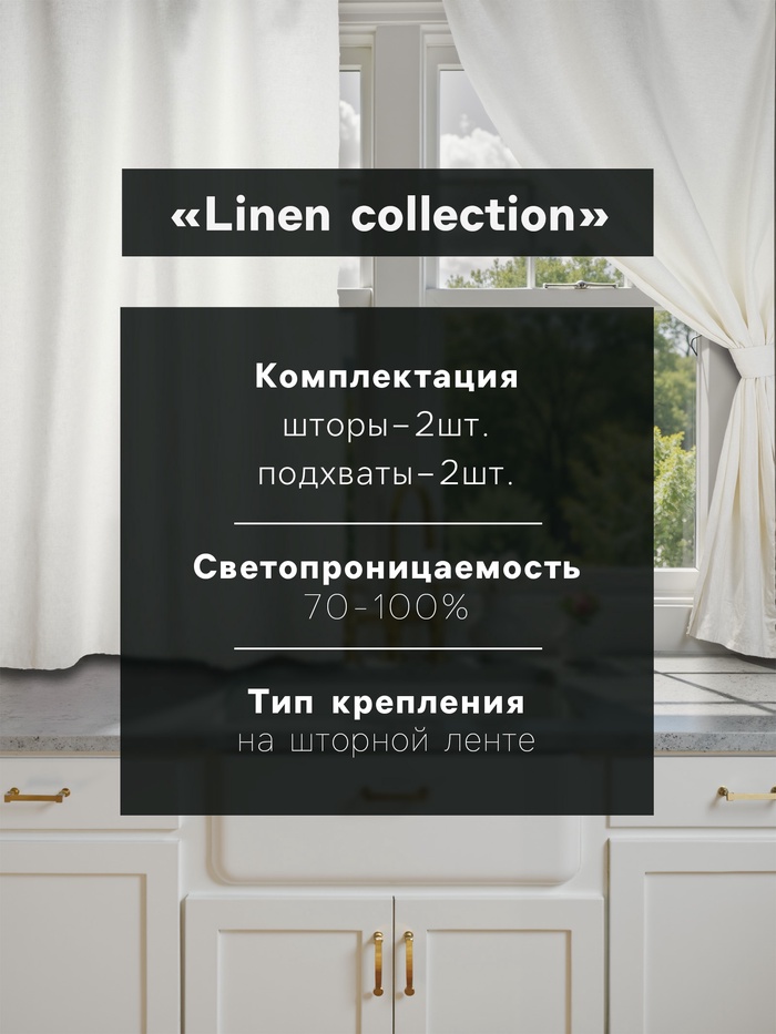 Этот комплект из двух льняных штор с подхватами создаёт в кухне мягкое, естественное освещение. Полотно плотностью 210 г/м² с фактурой под лён выглядит дорого и солидно, при этом остаётся воздушным и пропускает много света. Шторы готовы к установке — в комплекте есть всё необходимое для моментального преображения окна.