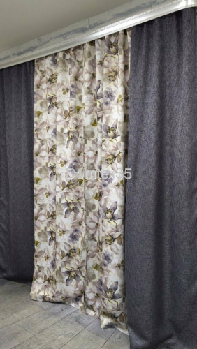 Комплект скомбинирован из рогожки блэкаут и портьеры с фотопечатью Цветы