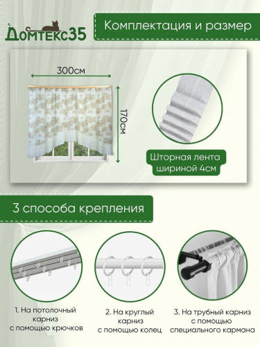 Тип крепления - шторная лента, стягивая которую, создаются качественные и аккуратные складки. Подойдет для любого вида карниза с крючками и зажимами.