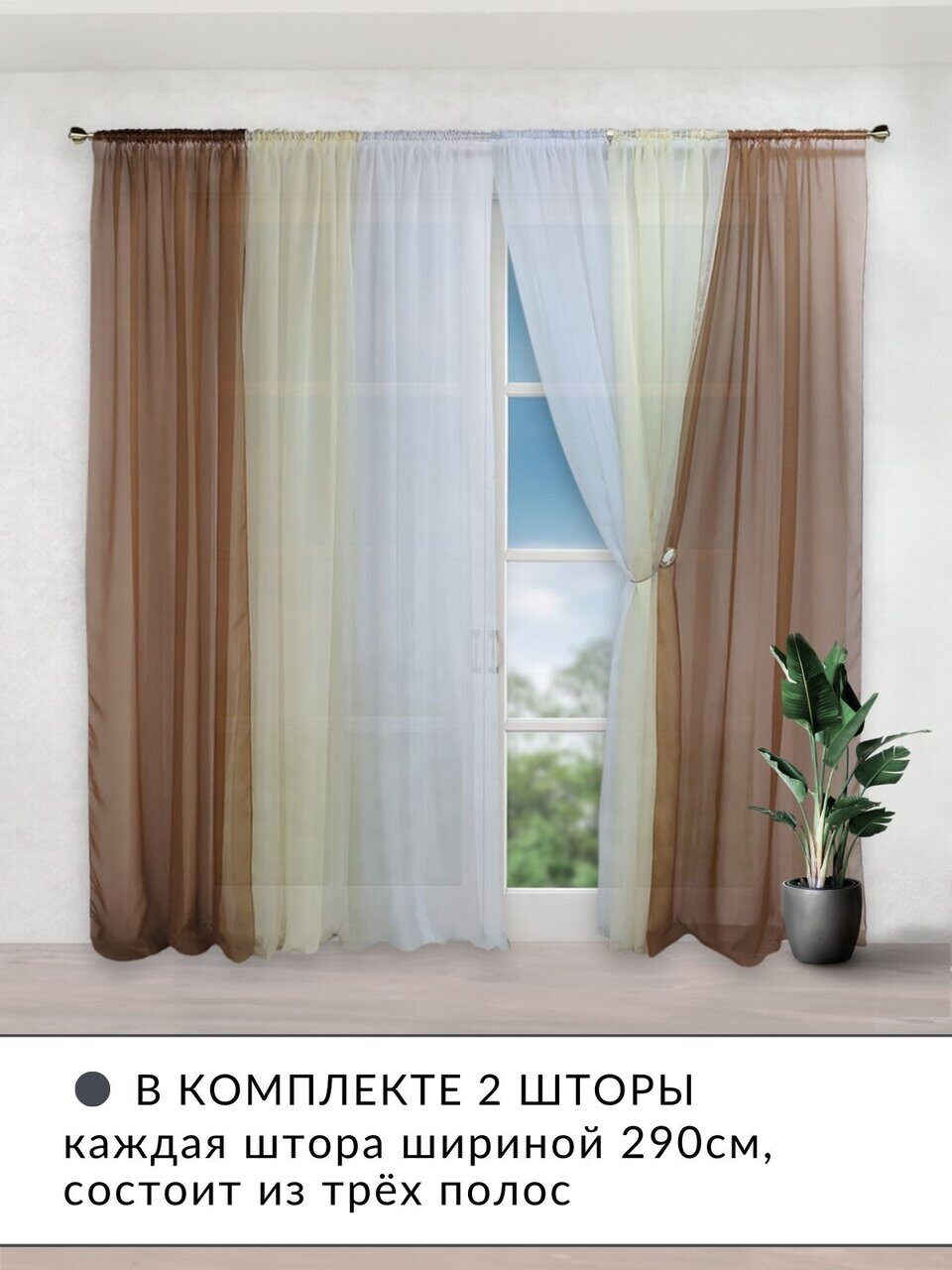 Модель состоит из двух штор, каждая из которых разделена на три полосы. Полосы между собой не сшиты по длине, а закреплены только сверху шторной лентой, таким образом получается очень удобный доступ к окну.