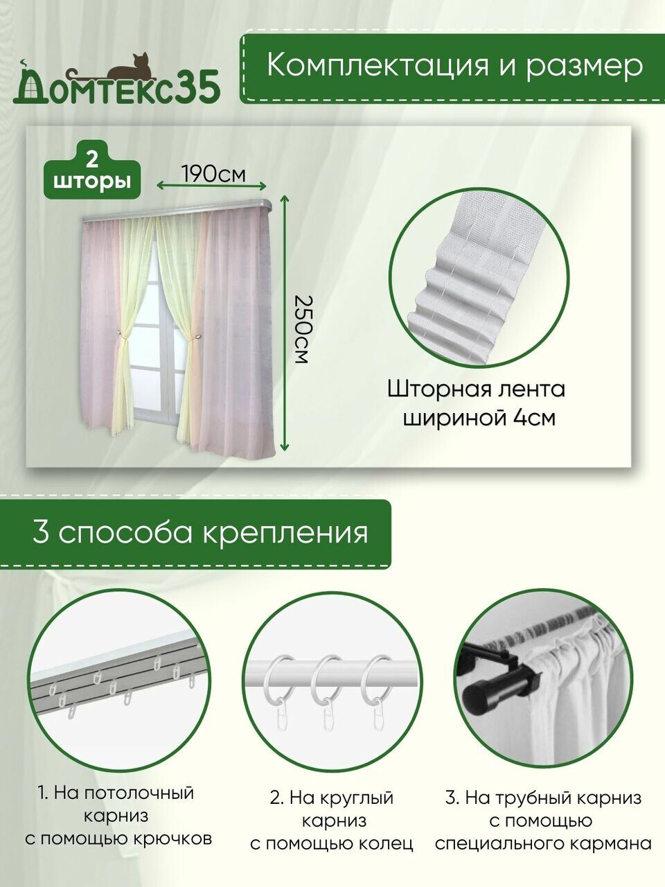 Тип крепления - шторная лента, стягивая которую, создаются качественные и аккуратные складки. Подойдет для любого вида карниза с крючками и зажимами.