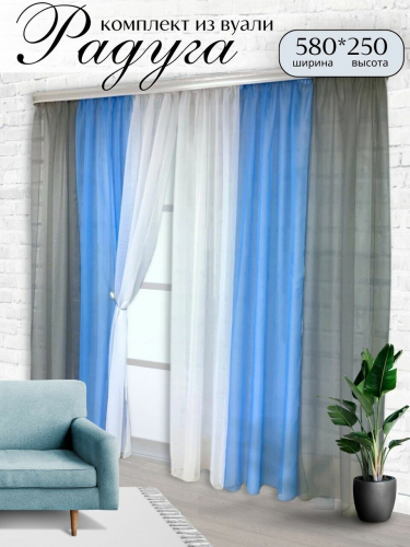 Шторы для комнаты комплект тюль вуаль "Радуга" серый/голубой