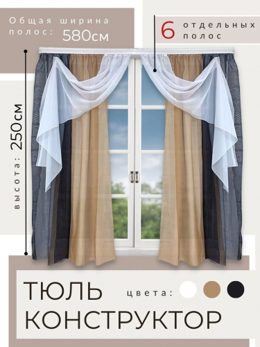 Модель состоит из двух штор, каждая из которых разделена на три полосы. Полосы между собой не сшиты по длине, а закреплены только сверху шторной лентой, таким образом получается очень удобный доступ к окну.