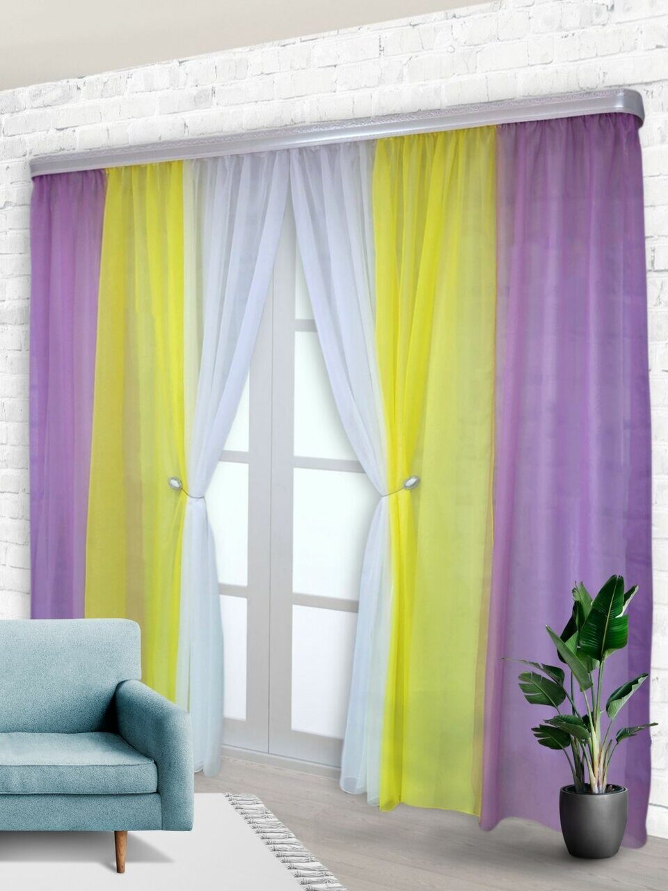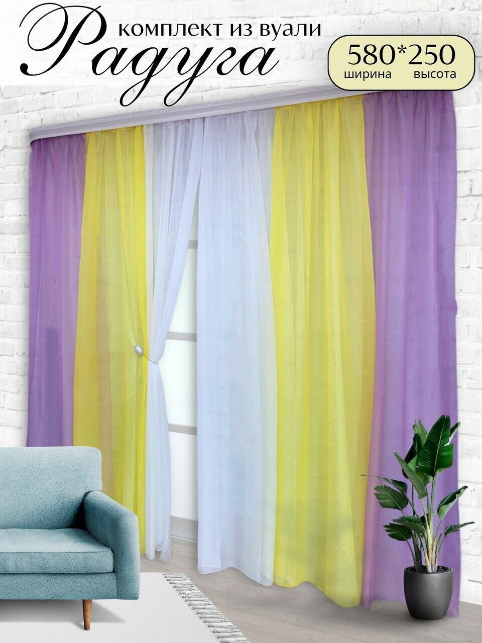Шторы для комнаты комплект тюль вуаль "Радуга" сиреневый/желтый
