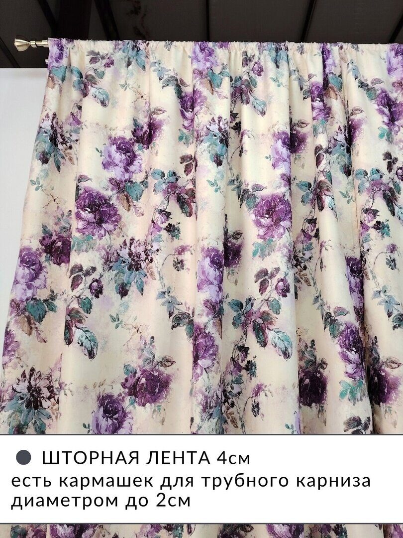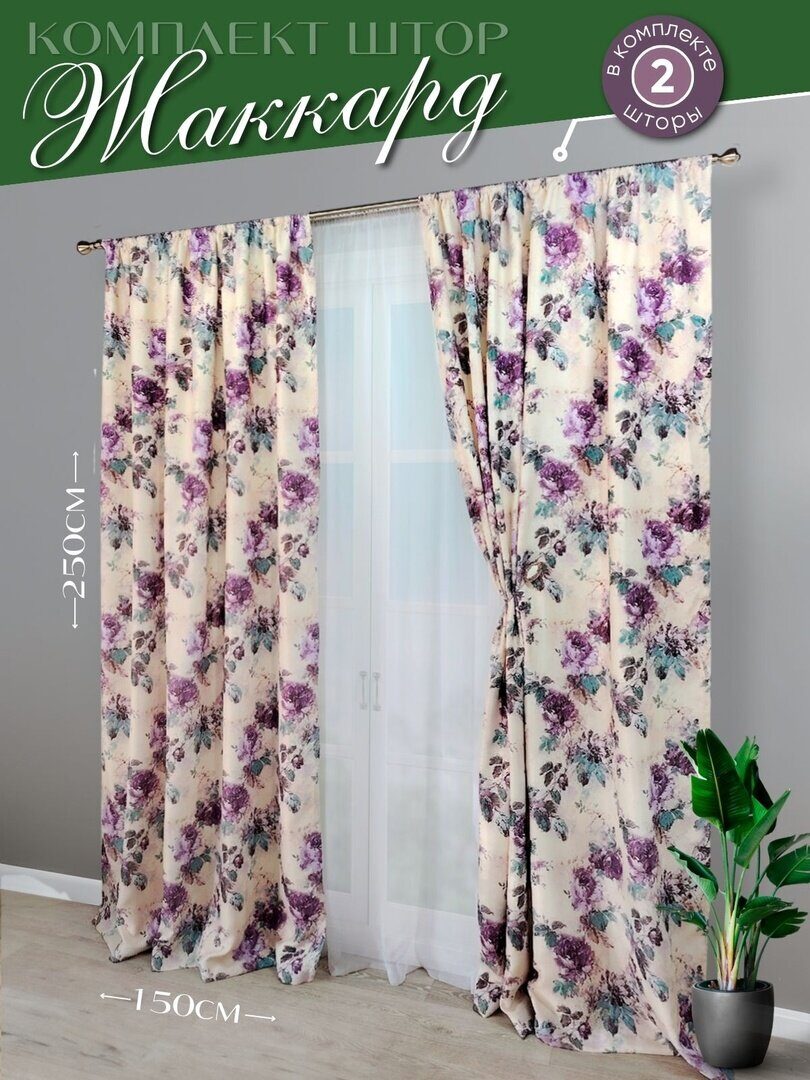 Комплект состоит из двух штор, которые изготовлены из жаккардовой ткани средней плотности с бархатистой лицевой стороной на которую нанесен печатный рисунок.