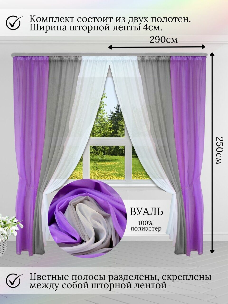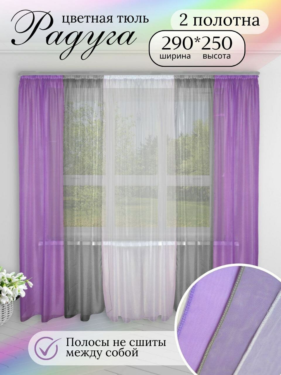 Шторы для комнаты комплект тюль вуаль "Радуга" сиреневый/серый