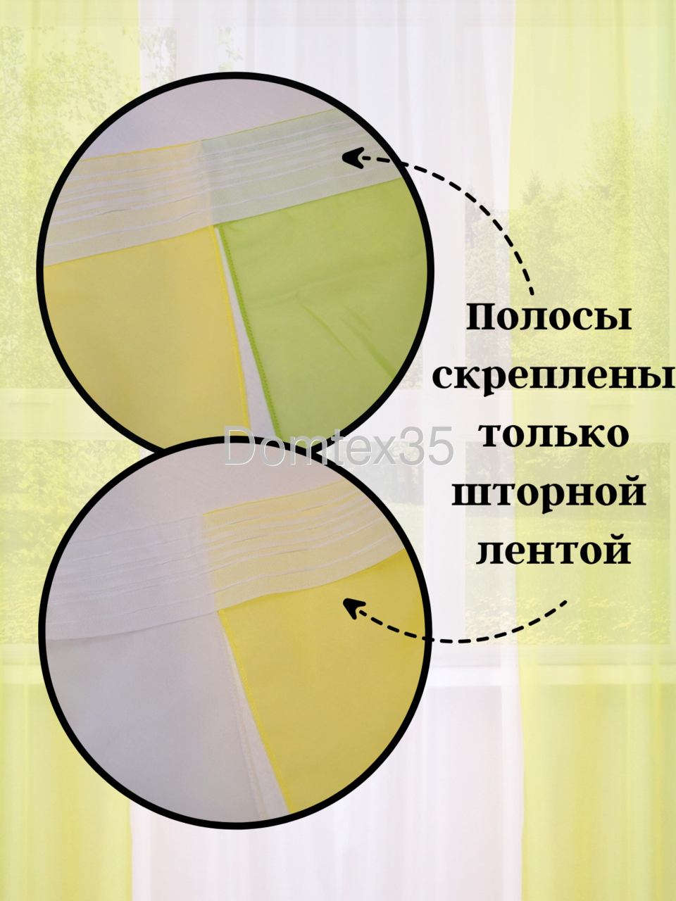Модель состоит из двух штор, каждая из которых разделена на три полосы. Полосы между собой не сшиты по длине, а закреплены только сверху шторной лентой, таким образом получается очень удобный доступ к окну.