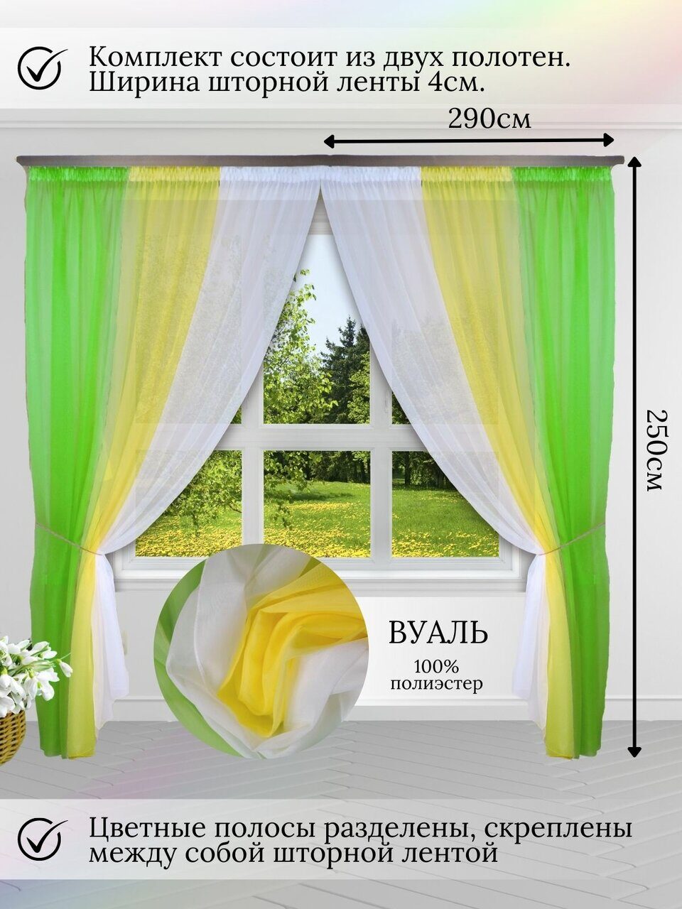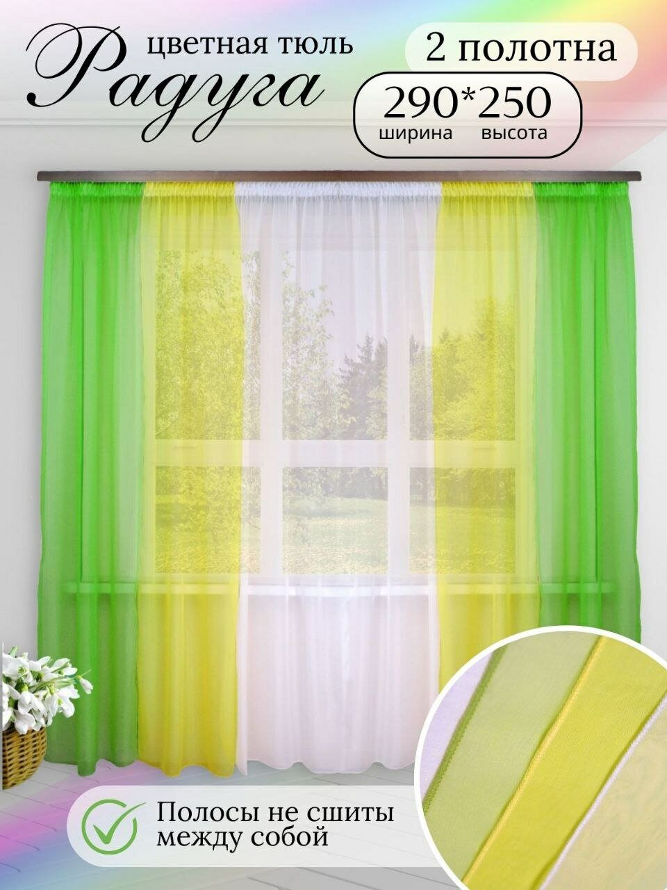 Шторы для комнаты комплект тюль вуаль "Радуга" зеленый/желтый