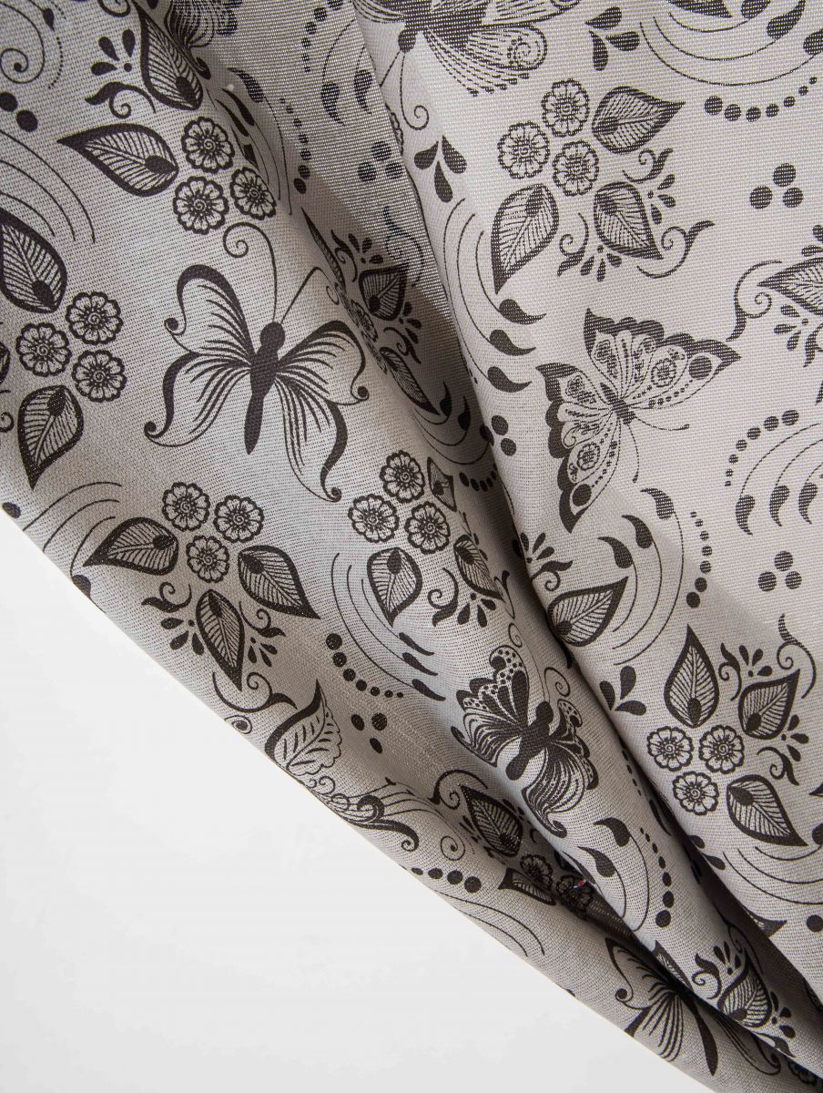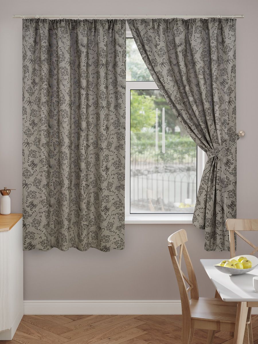 Набор штор состоит из 2-х полотен шириной 145 см и высотой 180 см и 2 подхватов с петлями из того же материала, что и сам комплект.