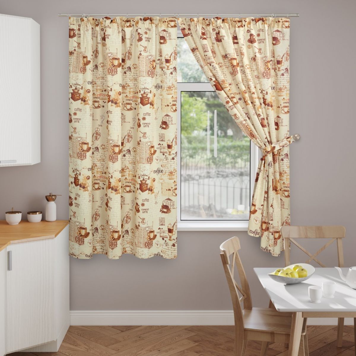 Набор штор состоит из 2-х полотен шириной 145 см и высотой 180 см и 2 подхватов с петлями из того же материала, что и сам комплект.