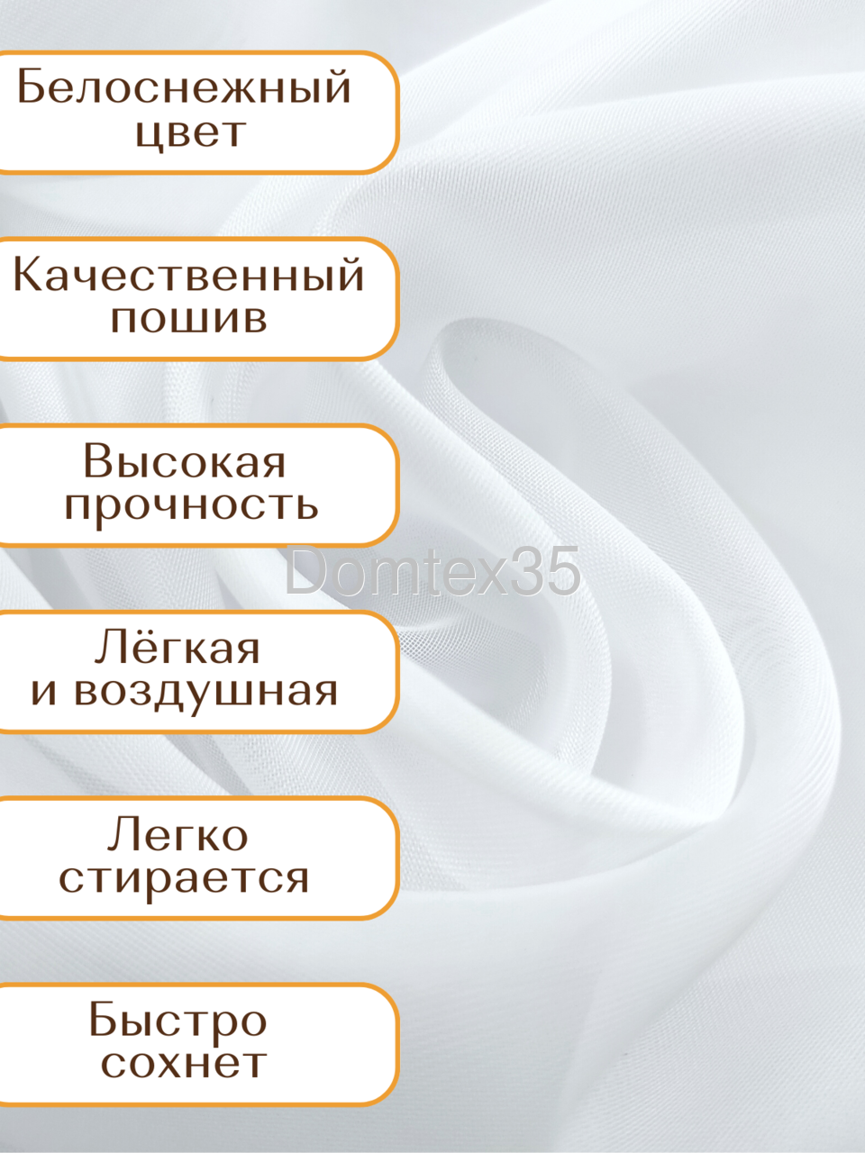 Вуаль представляет собой тонкое полупрозрачное полотно полотняного переплетения, с мягким матовым блеском. Его волокнистый состав – 100% п/э волокна.