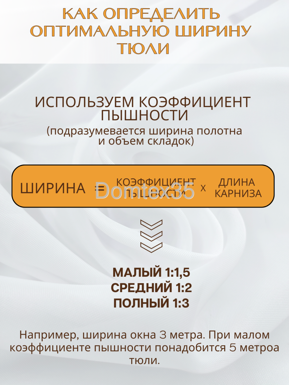 Вуаль представляет собой тонкое полупрозрачное полотно полотняного переплетения, с мягким матовым блеском. Его волокнистый состав – 100% п/э волокна.