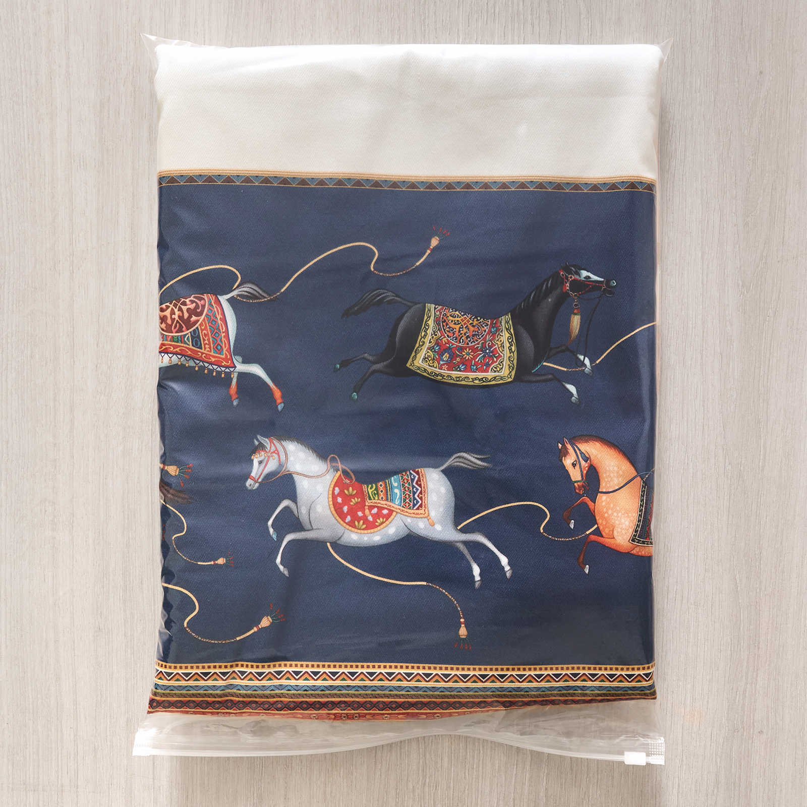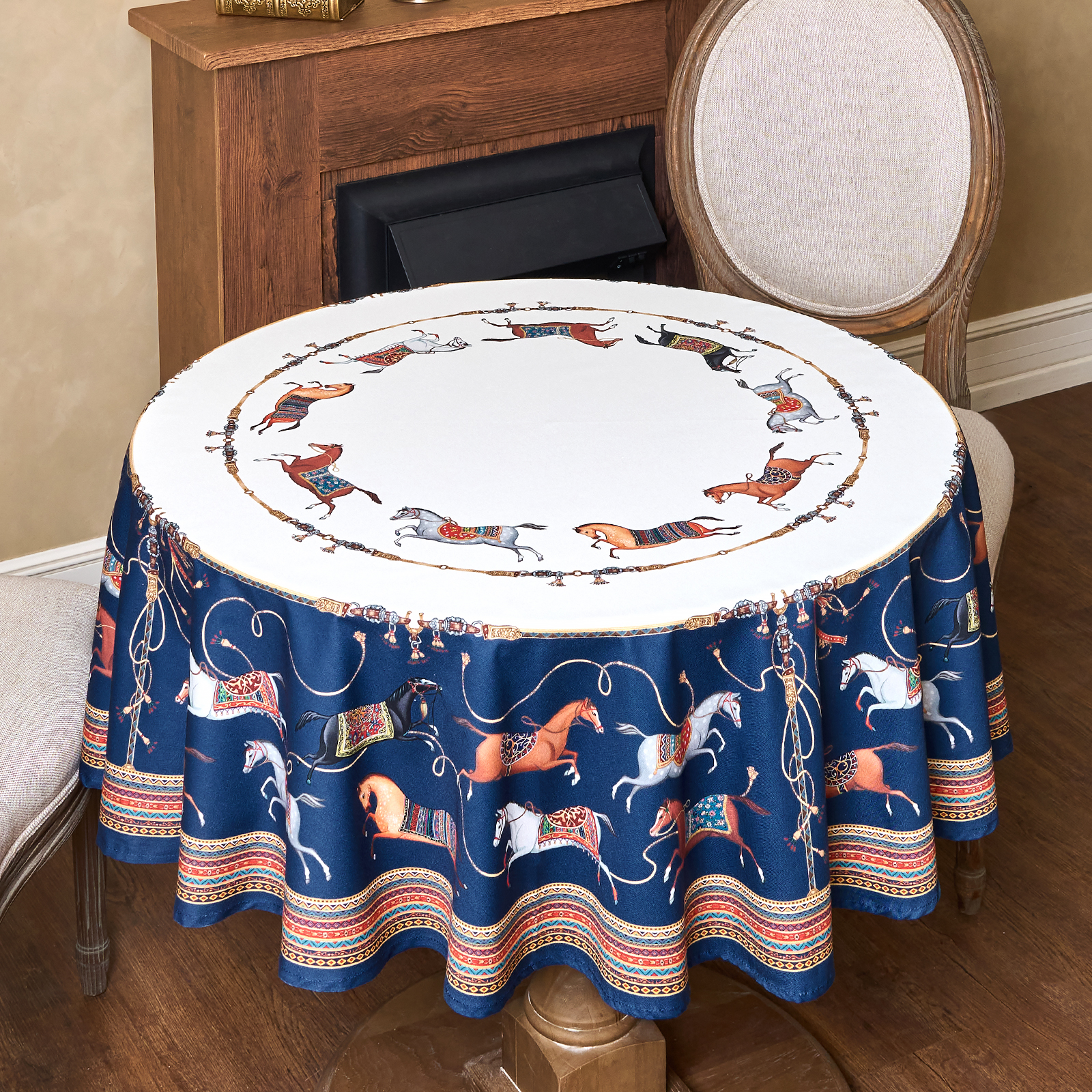 Темно-синий фон украшен авторским орнаментом с изящными лошадьми — символом 2026 года. Такой принт делает скатерть особенно уместной для праздничной сервировки и стильным украшением интерьера. Рисунок разработан художниками Lefard и нанесён методом цифровой печати, что обеспечивает стойкость красок даже после множества стирок.