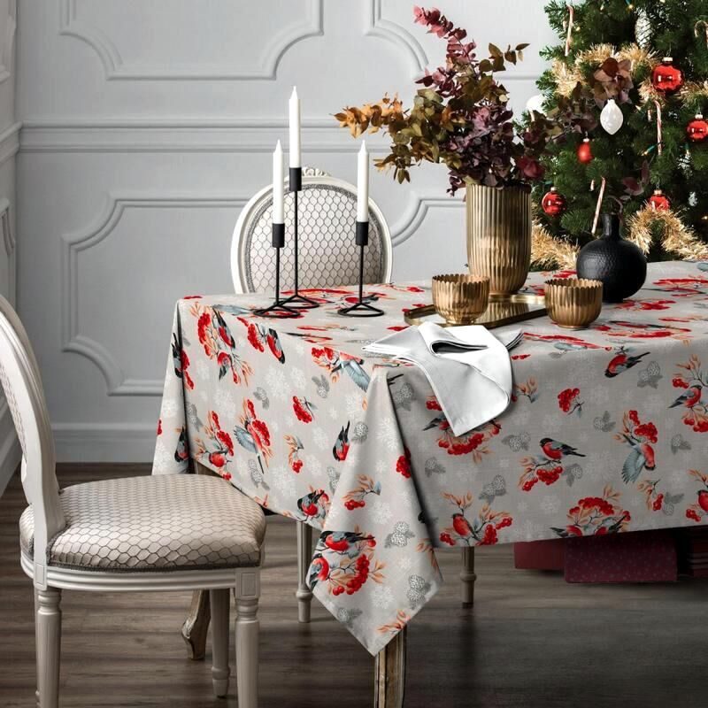 Скатерть "Снегири и рябина" 150*180см. рогожка хлопок 100%