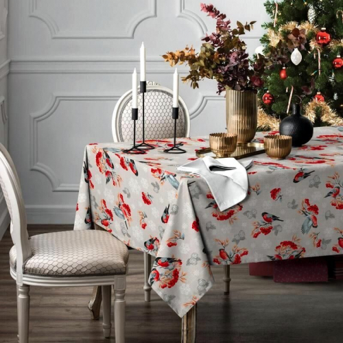 Скатерть "Снегири и рябина" 150*220см. рогожка хлопок 100%