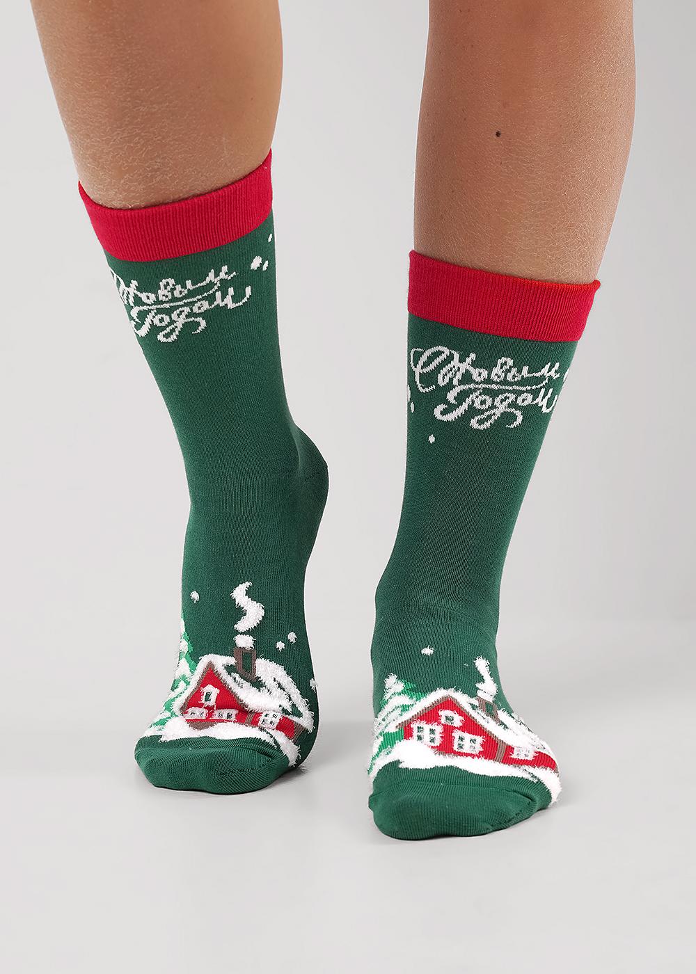 Носки мужские с рисунком дом в зимнем лесу, снег выполнен из пряжи травка, и надписью С Новым годом!