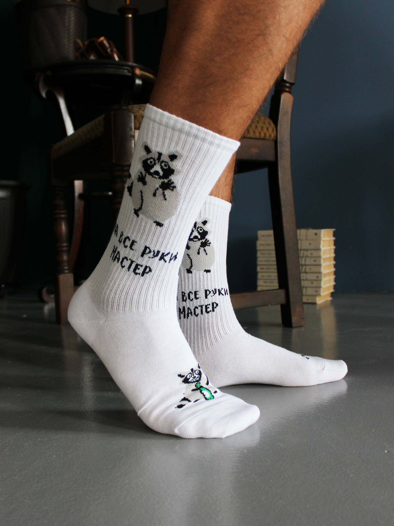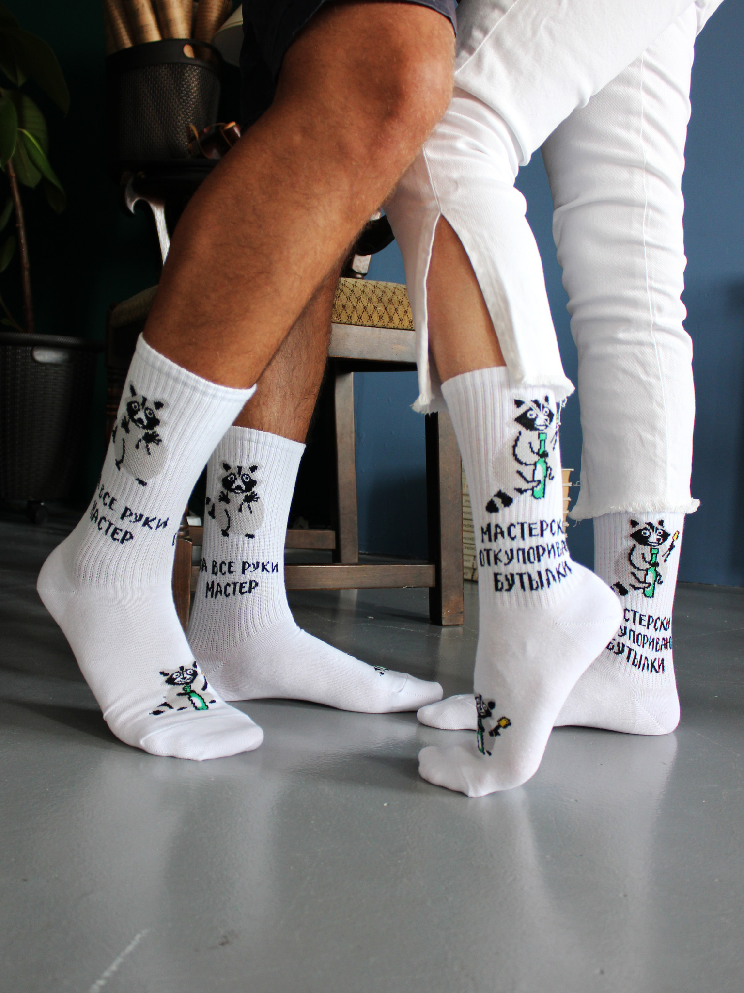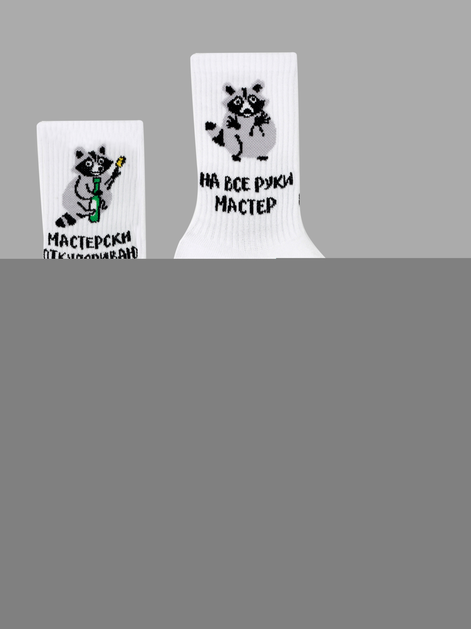 2х сторонние носки. На 1 стороне принт Енота с надписью Мастер на все руки" на 2й стороне принт Енота с бутылкой и надписью "Мастерски откупориваю бутылки"