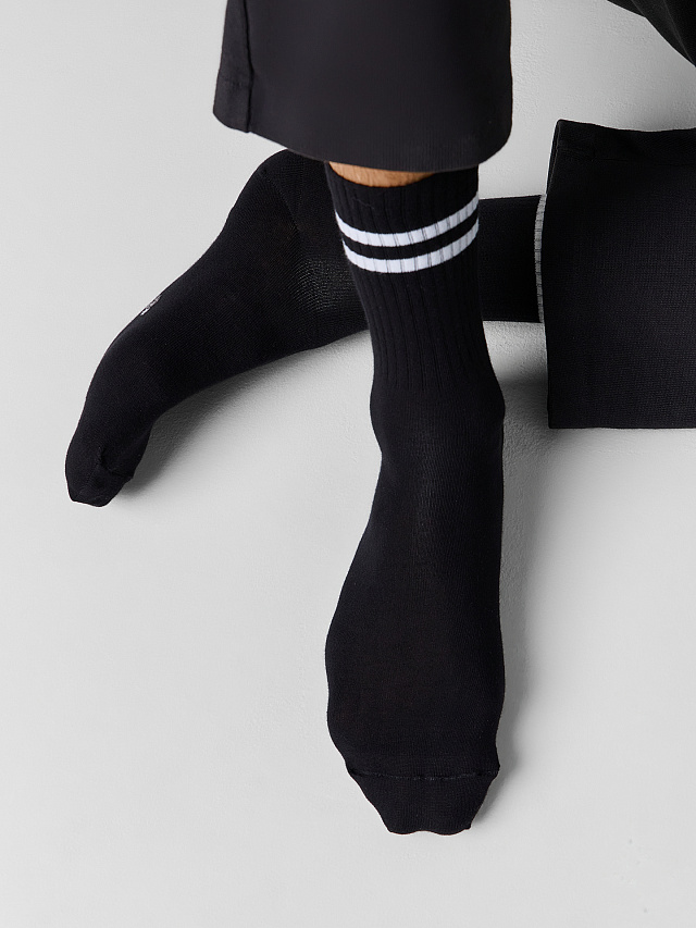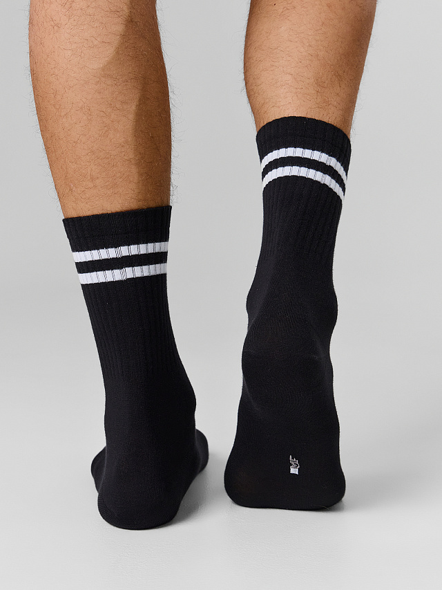 Высокий гладкий носок с плотной резинкой и рисунком в виде двух полосок на борту. Состав: 2% эластан / 23% ПА / 75% хлопок