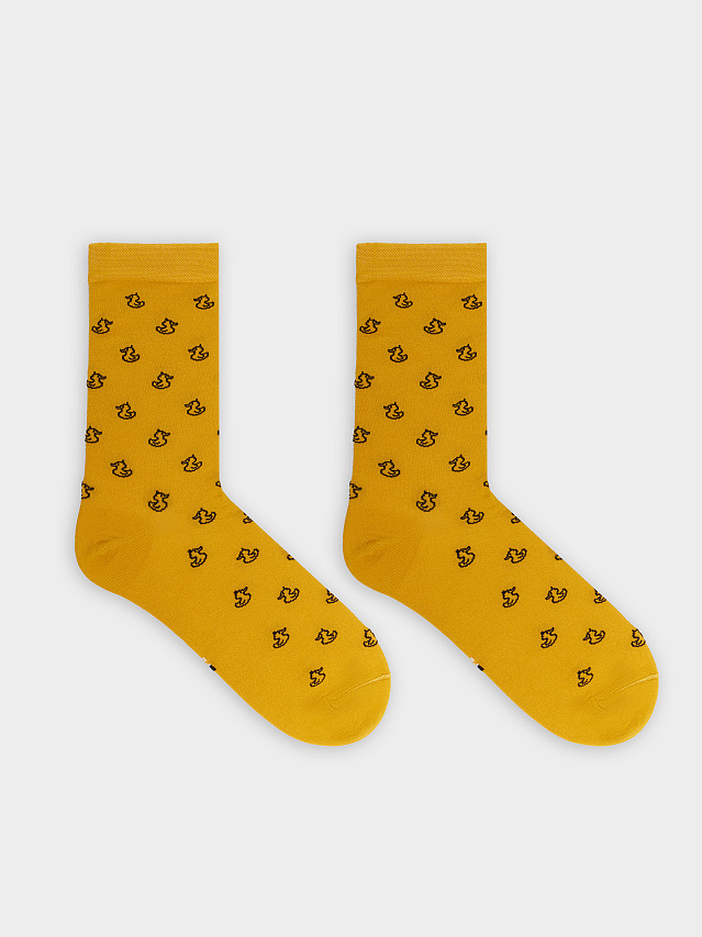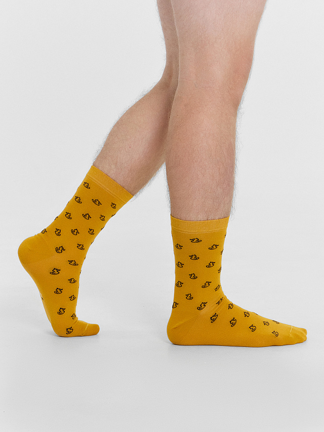 Длинные носки мужские классические с высоким бортом и с рисунком в виде уточек — оригинальный и удобный вариант для ежедневной носки. Выполнены из гребенного хлопка - пряжи высочайшего качества, мягкой, тонкой, но прочной. Натуральные волокна отлично пропускают воздух, позволяя коже дышать, и впитывают влагу, дарят ощущение комфорта в течение всего дня. Благодаря небольшому количеству эластана в составе, длинные носки хорошо облегают стопу и сохраняют форму даже после множества стирок. Мягкая эластичная резинка надежно удерживает носки на ноге, но не давит. Пятка и мысок дополнительно усилены, что гарантирует защиту от протирания и повышенную износостойкость — мужские носки с принтом прослужат долго. Отличный выбор на каждый день. Рекомендуем!