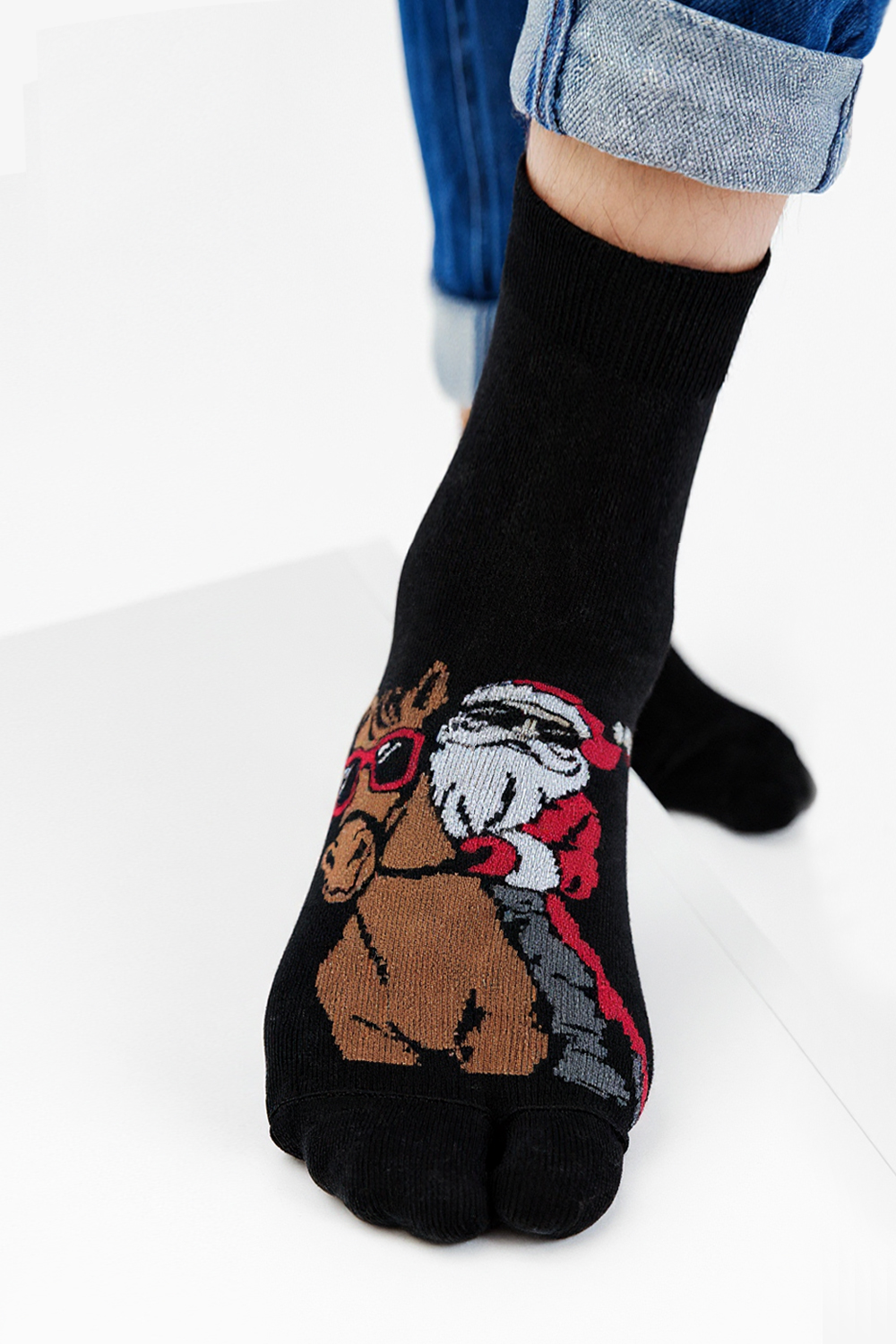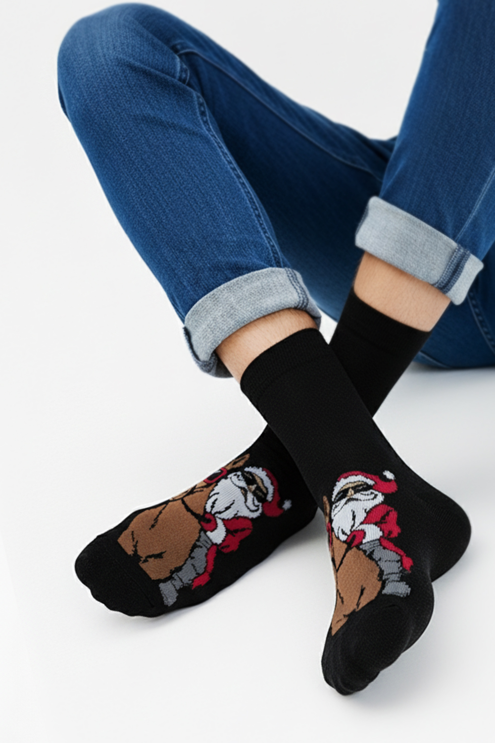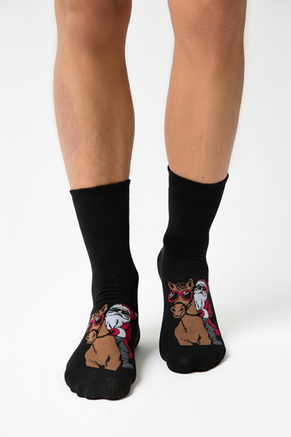 Отличные мужские носки с новогодней тематикой. В наборе 1 пара носков с изображением символа Нового года. Расцветка: черный (ед.); Состав: 80% х/б 18% ПА 2% эластан.