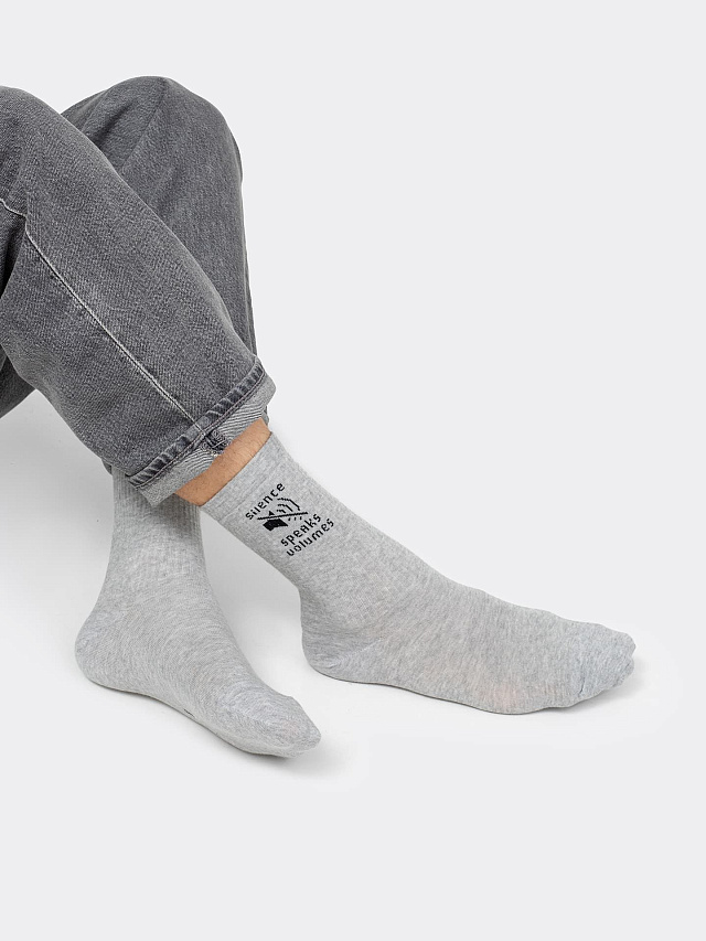 Носки мужские с рисунком в виде надписи - отличная возможность внести разнообразие и поднять настроение. Длинные и короткие мужские носки с принтом изготовлены из гребенного хлопка - пряжи высочайшего качества, мягкой, тонкой, но прочной. Натуральные волокна отлично пропускают воздух, позволяя коже дышать, и впитывают влагу, дарят ощущение комфорта в течение всего дня. Благодаря небольшому количеству эластана в составе, носки хорошо облегают стопу и сохраняют форму даже после множества стирок. Мягкая эластичная резинка надежно удерживает носки на ноге, но не давит. Пятка и мысок дополнительно усилены, что гарантирует защиту от протирания и повышенную износостойкость - мужские носки с принтом прослужат долго. Не важно, выберете ли вы носки длинные мужские с принтом или короткие с рисунком на стопе - они сохранят яркость цвета, рисунок на них не потускнеет и не деформируется. В ассортименте белорусского бренда Mark Formelle вы всегда найдете большой выбор расцветок и уникальных авторских дизайнов, сможете купить носки мужские с принтом набором и отдельно.