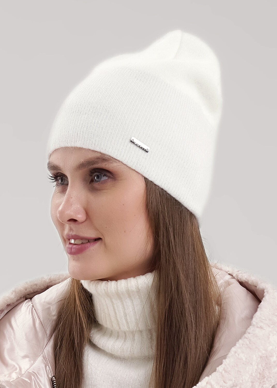 Шапка женская двойная без отворота с пряжей ангора, без подклада, декорирована стильной нашивкой в височной зоне. Станет не только отличной защитой от холода, но и модным аксессуаром.