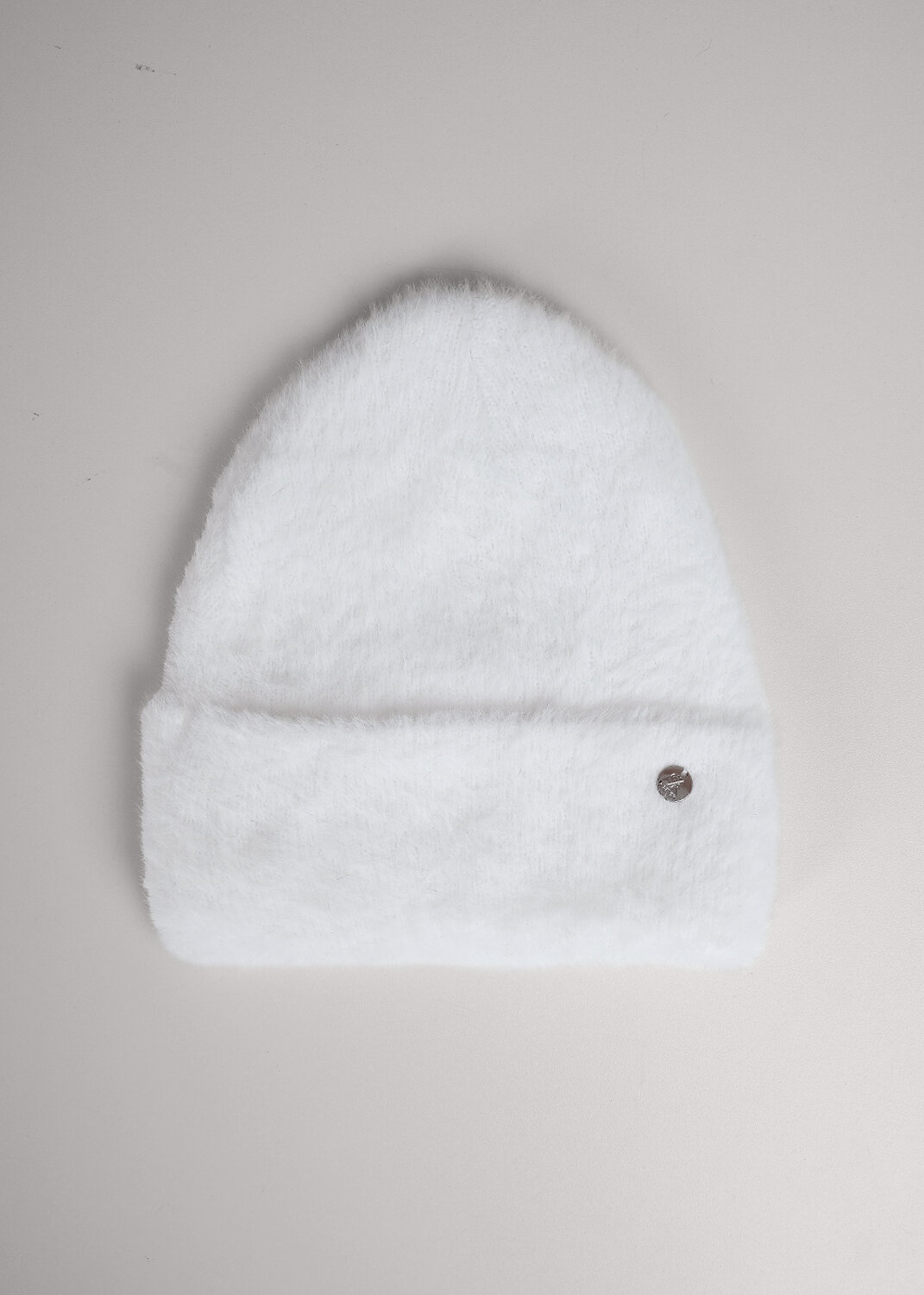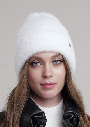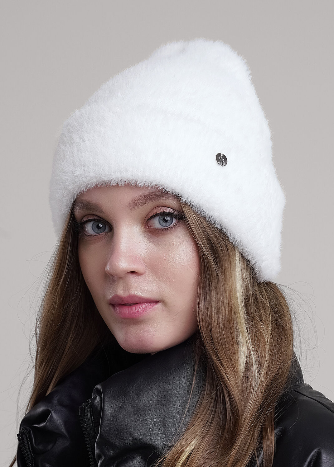 Женская двойная шапка с отворотом, без подклада. Выполнена из высококачественной пряжи, декорирована стильной нашивкой. Станет не только отличной защитой от холода, но и модным аксессуаром.