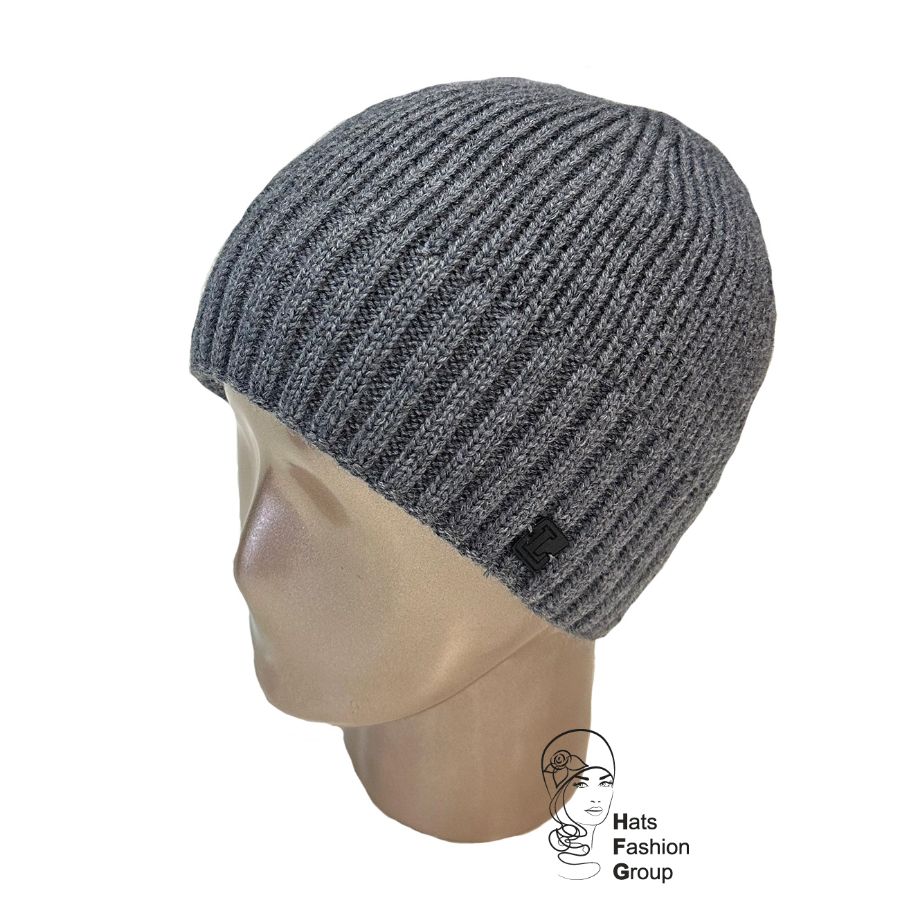Мужская полуторная шапка по голове. Шапка выполнена из полушерстяной пряжи. Вязка резинкой придает дополнительный объем изделию. Сбоку шапка украшена фирменной кожаной шильдой. Длина изделия - 20 см.