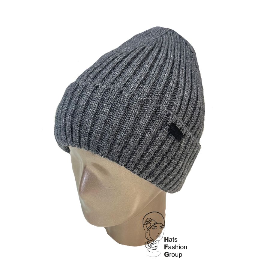 Теплая мужская шапка по голове. Шапка с отворотом, выполнена из полушерстяной пряжи, утеплена флисом. Вязка резинкой 2х2 придает дополнительный объем изделию. Сбоку шапка украшена фирменной кожаной шильдой. Длина изделия - 22 см, отворот - 8 см.