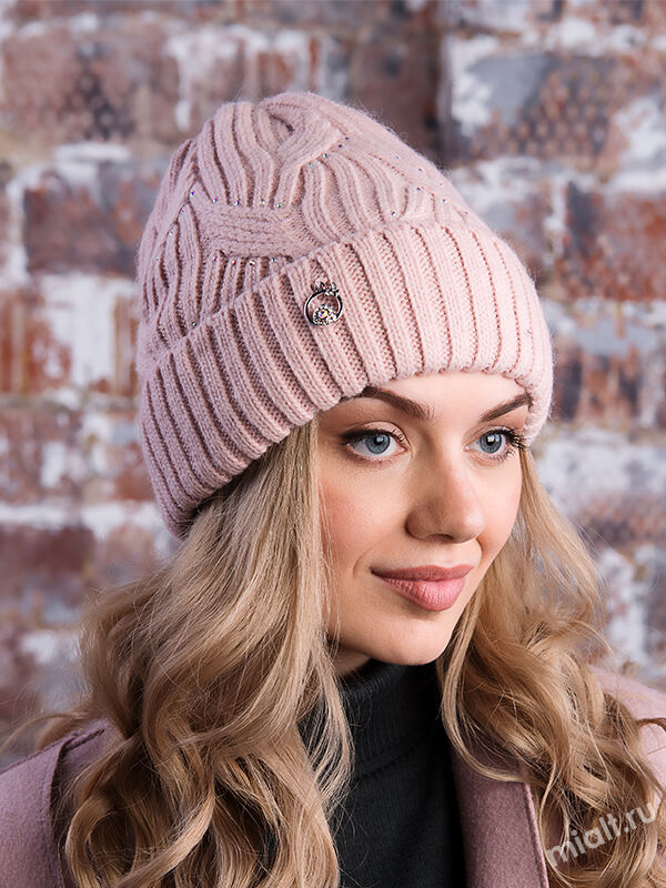 Шапка для молодой девушки или девочки школьного возраста. Модель удлиненной формы на  хлопковой подкладке.  Отворот, связанный в резинку, украшен подвеской. Фронтальная часть головного убора декорирована стразами.