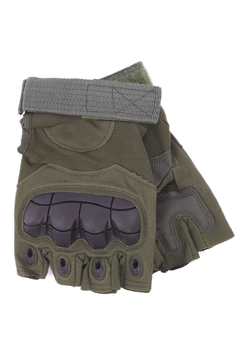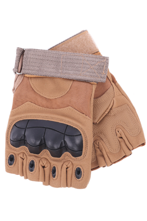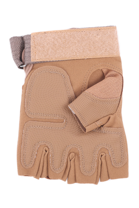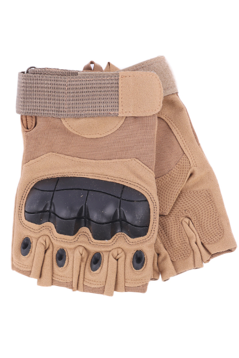 Перчатки без пальцев изготовлены из текстиля, полиэстера и вставками из флиса. На ладони усиленная вставка из кожи с уплотнителем. Накладки для костяшек выполнены из специального ударопрочного прорезиненного материала. Надежная фиксация велкро-липучкой вокруг запястья.