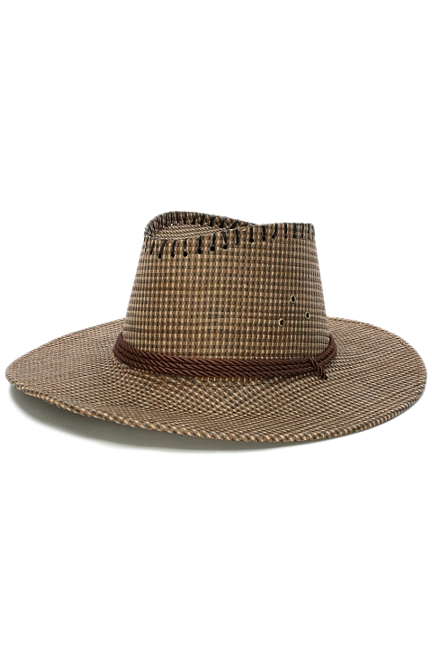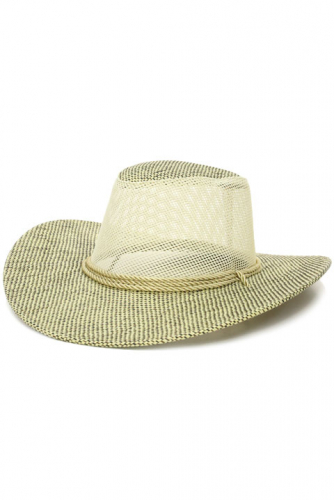 Шляпа легкая выполнена из бумажной пряжи на мягкой клеевой основе. Высота тульи 11 см, ширина поля 9 см. Модель дополнена шнурком с фиксатором.