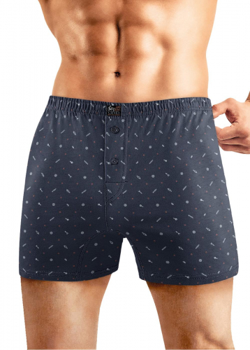 Боксеры комфортной посадки выполнены из оригинального полотна в мелкую графику. Трусы дополнены пуговицами и жаккардовым логотипом.