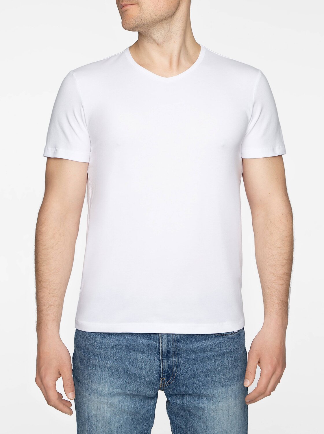 Фуфайка мужская из эластичного трикотажного полотна с коротким втачным рукавом. Горловина V-образной формы обработана окантовкой из основного полотна.