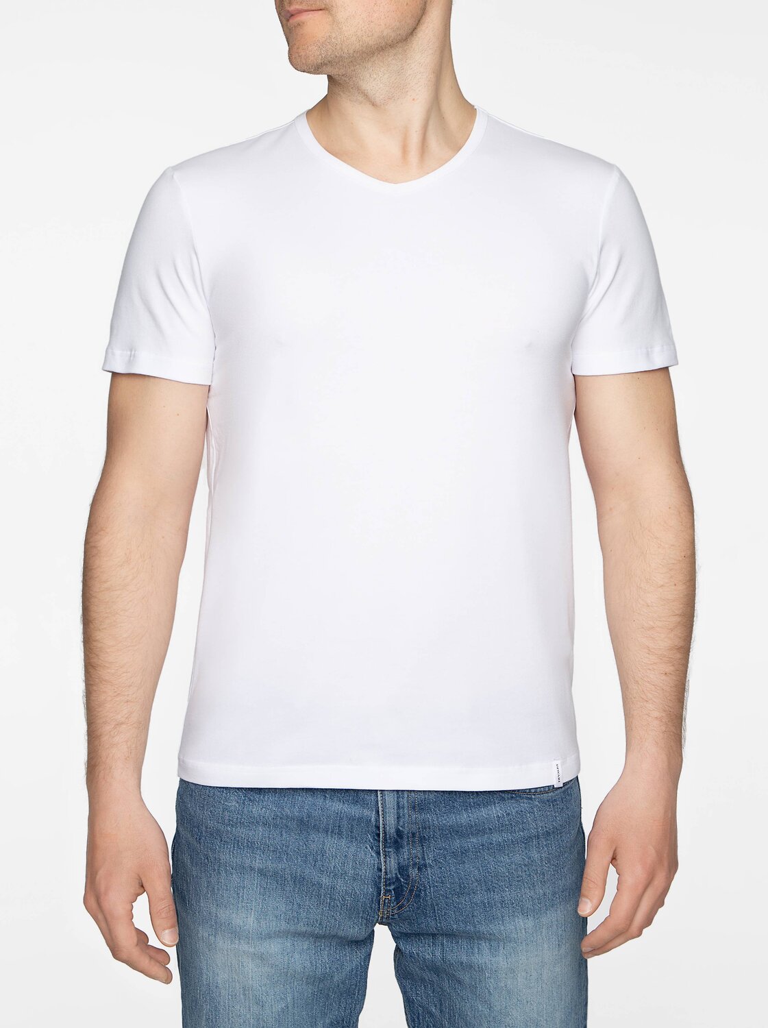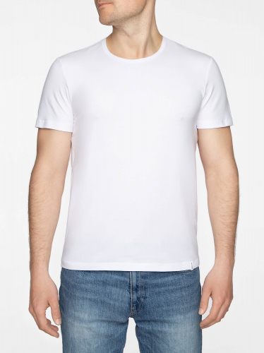 Фуфайка мужская из эластичного трикотажного полотна с коротким втачным рукавом. Горловина V-образной формы обработана окантовкой из основного полотна.