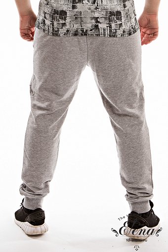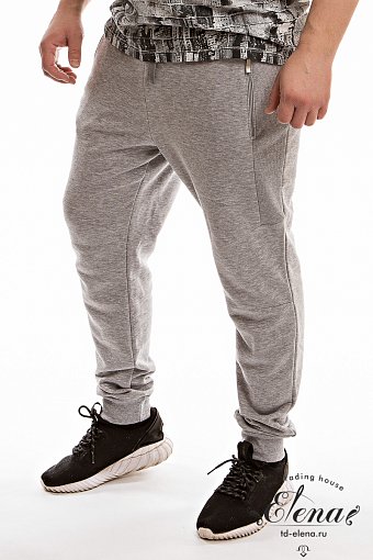 Брюки выполнены из однотонного футера воздушки. С притачным поясом и манжетами внизу. В поясе через люверсы проложен шнур. По бокам размещены карманы на молнии и декоративные вставки из отделочного полотна.