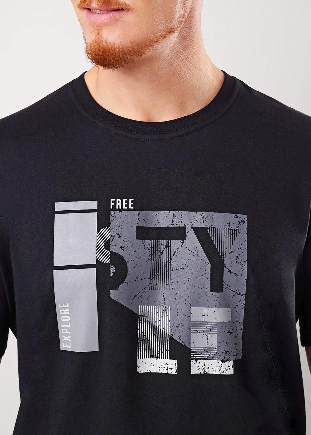 Фуфайка с коротким рукавом среднего объема, с оригинальным принтом, круглым вырезом горловины, которая оформлена обтачкой из рибаны.