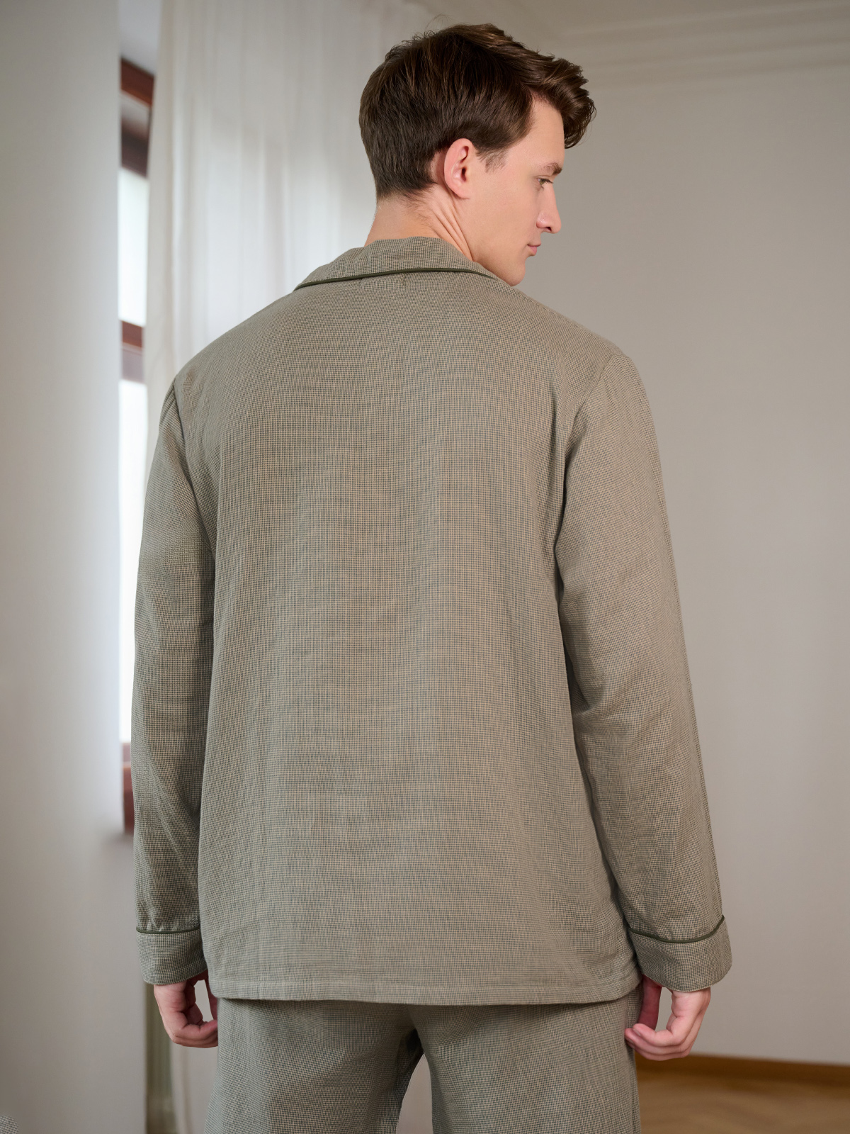 В комплект входит рубашка и брюки цвета хаки с мелким текстурным узором.